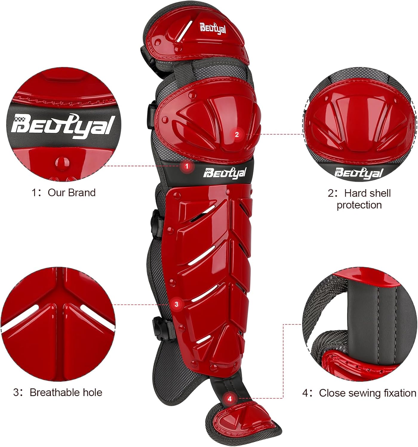 Beutyal Baseball Catcher’s Leg & Knee Guards designed for baseball catchers, our leg guards provides a perfect balance of flexibility for free movement and panel knee padding for superior protection against impacts, especially when umpires are in a crouched position. This design, ensures a secure and comfortable fit throughout long games, allowing umpires to stay focused on the game.