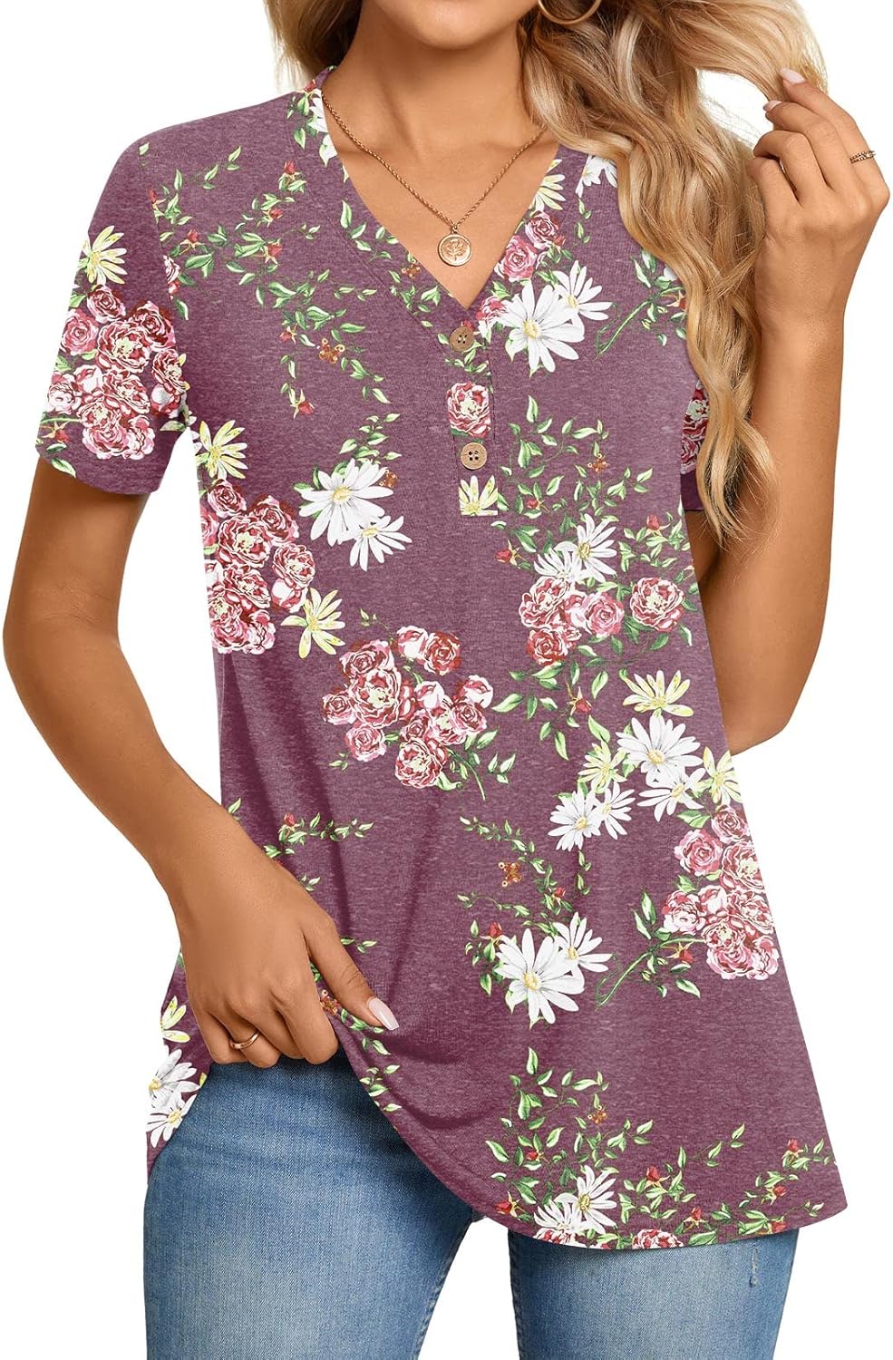BISHUIGE Womens Henley Tunic Tops Button Up Tshirts Short Sleeve Vneck Casual Blouses