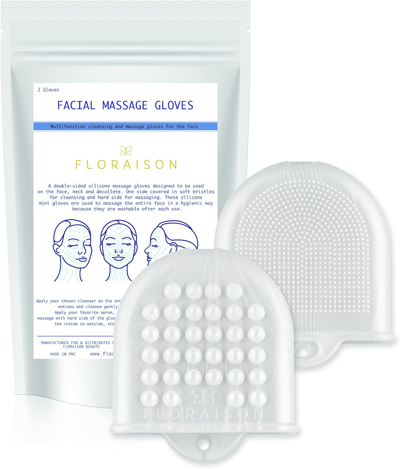 A double sided silicone massage gloves designed to be used on the face, neck and decollete. One side is covered in soft bristles for cleansing and hard side for massaging.