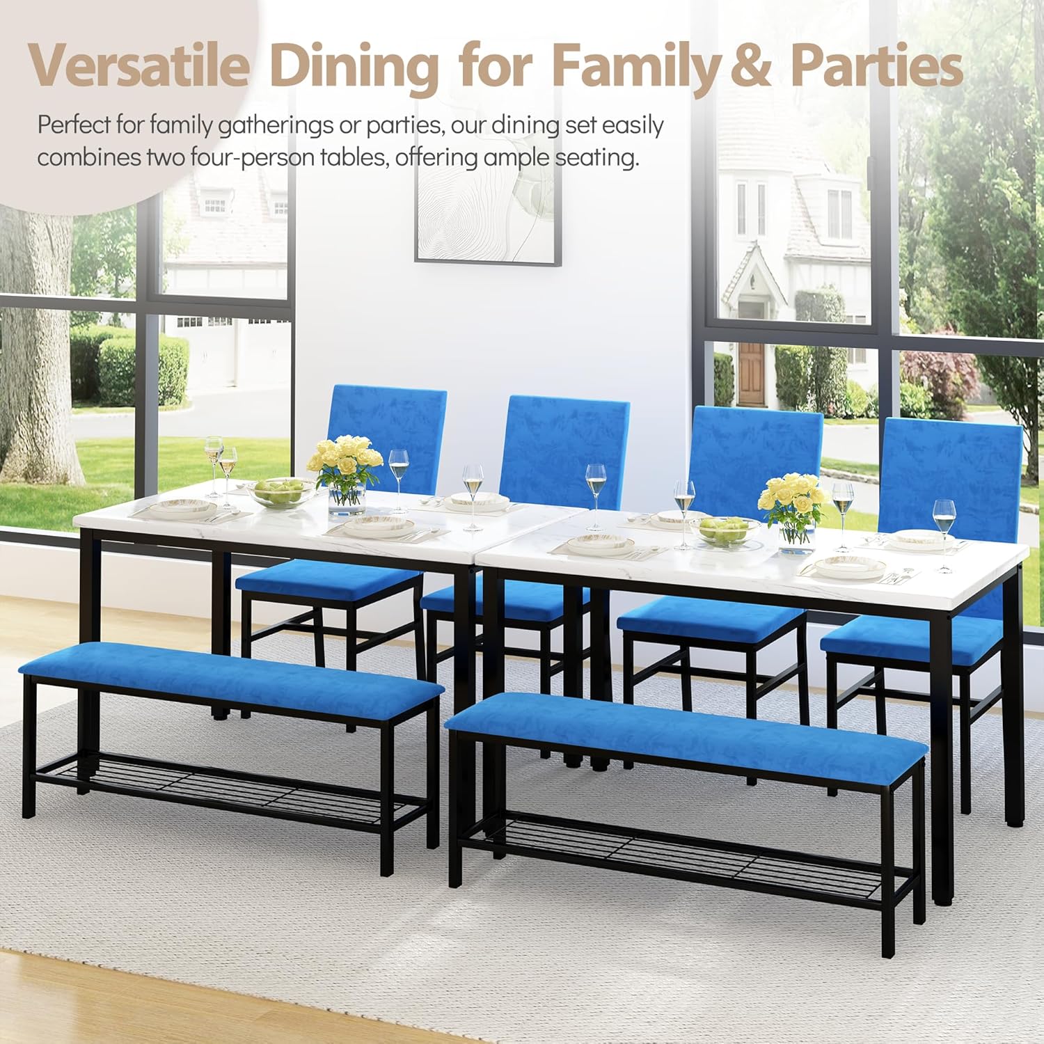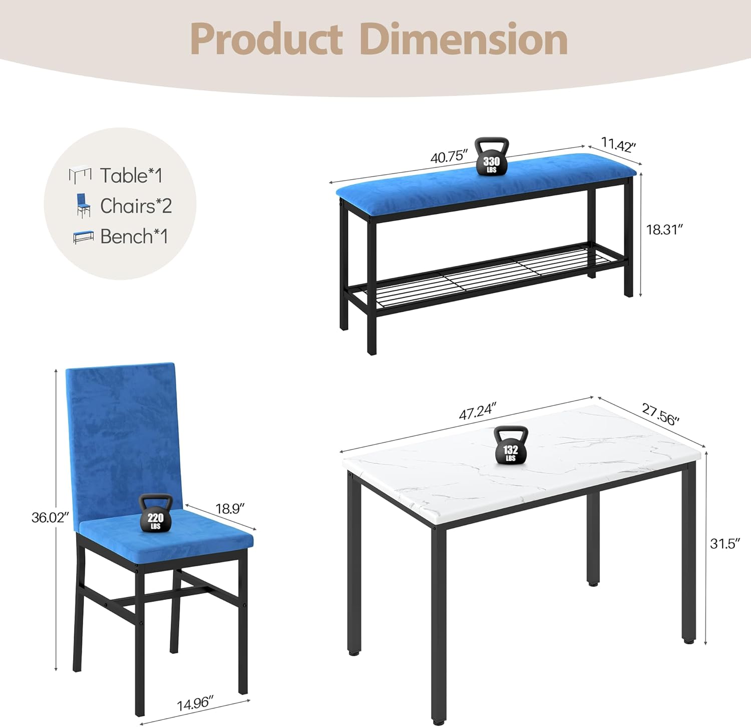 Be the first to review “4-Piece Dining Table Set for 4, 47.24-Inch Kitchen Table with Upholstered Velvet Bench & Chairs, Space-Saving Modern Faux Marble Dining Room Table Set for Small Spaces (Blue)”