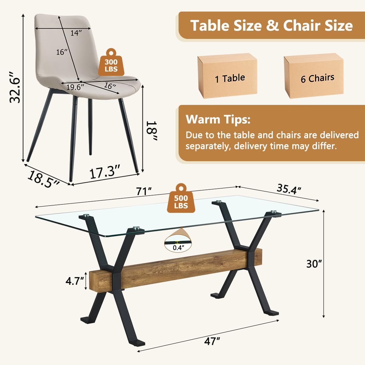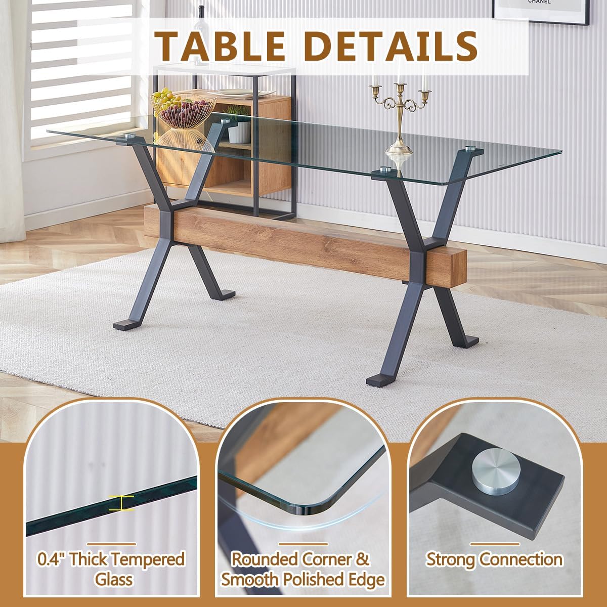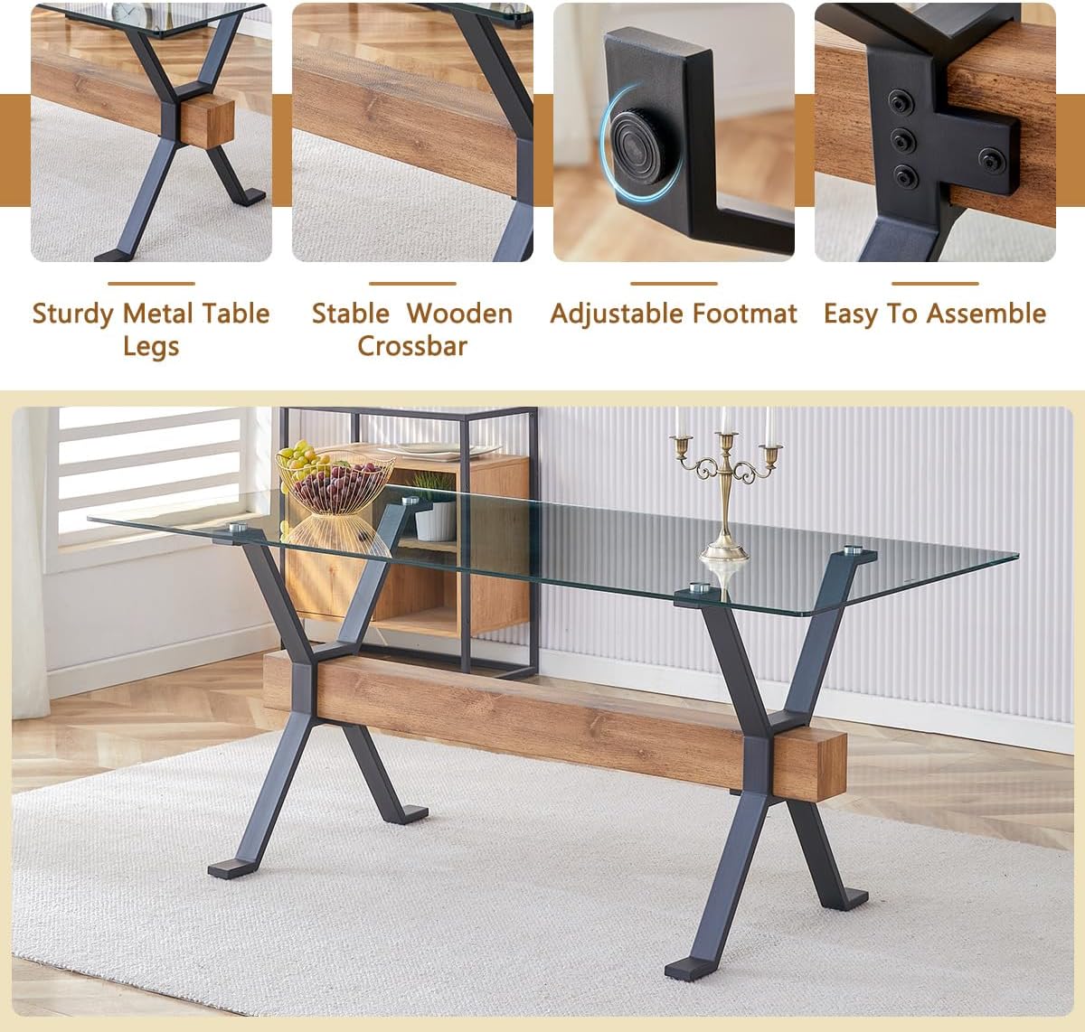 【0.4″ Tempered Glass Tabletop & Plated Metal Legs with MDF Crossbar】The size of the dining table is 70.9” x 35.4” x 29.9”. The size of the chairs is 19.6”x 18.5”x 32.6”. The strong plated metal legs bring more safety to the 0.4”thick transparent tempered glass tabletop, make the table more stable. Dining chairs fit perfectly under the dining table, maximizing space.