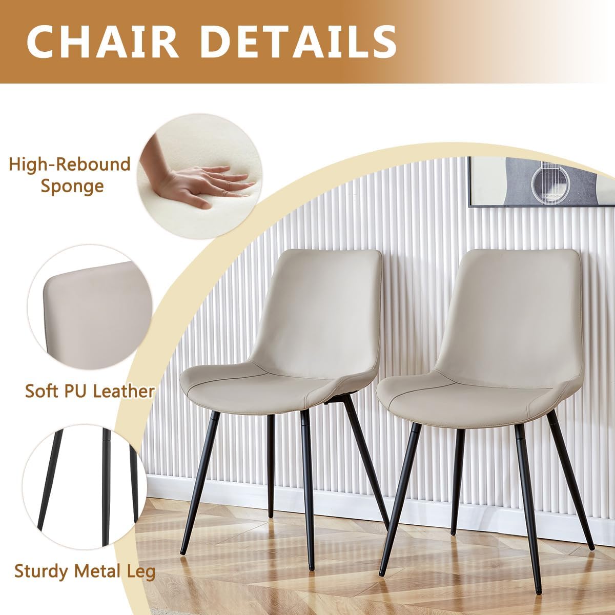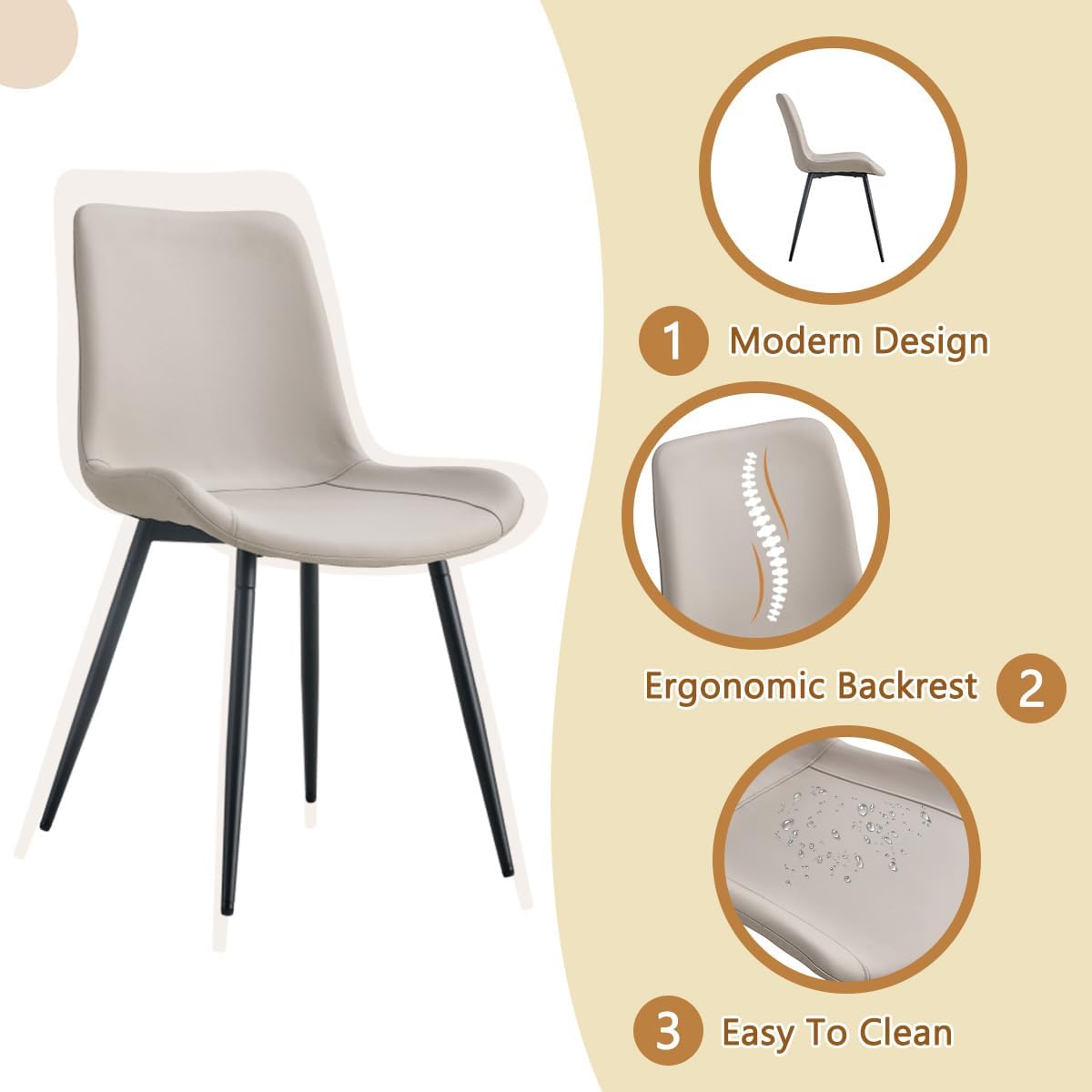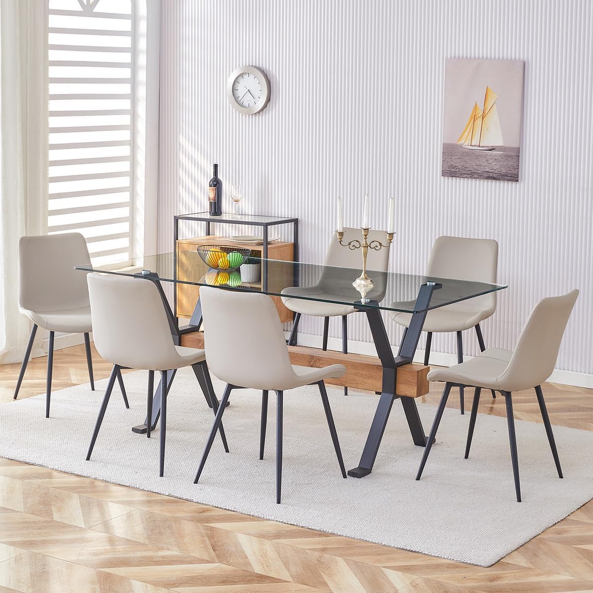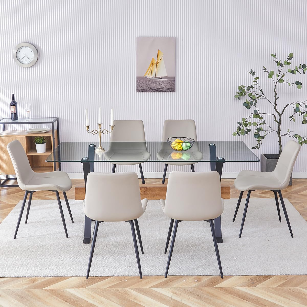 【Kitchen Table Chairs Set for 6】Soft and skin-friendly PU leather Upholstered seat for comfort. Backrest and footrest enhance comfort. The plated metal frame with no wobbling issues, Sleek and durable transparent tempered glass tabletop and PU leather chairs will allow you to keep them clean easily.