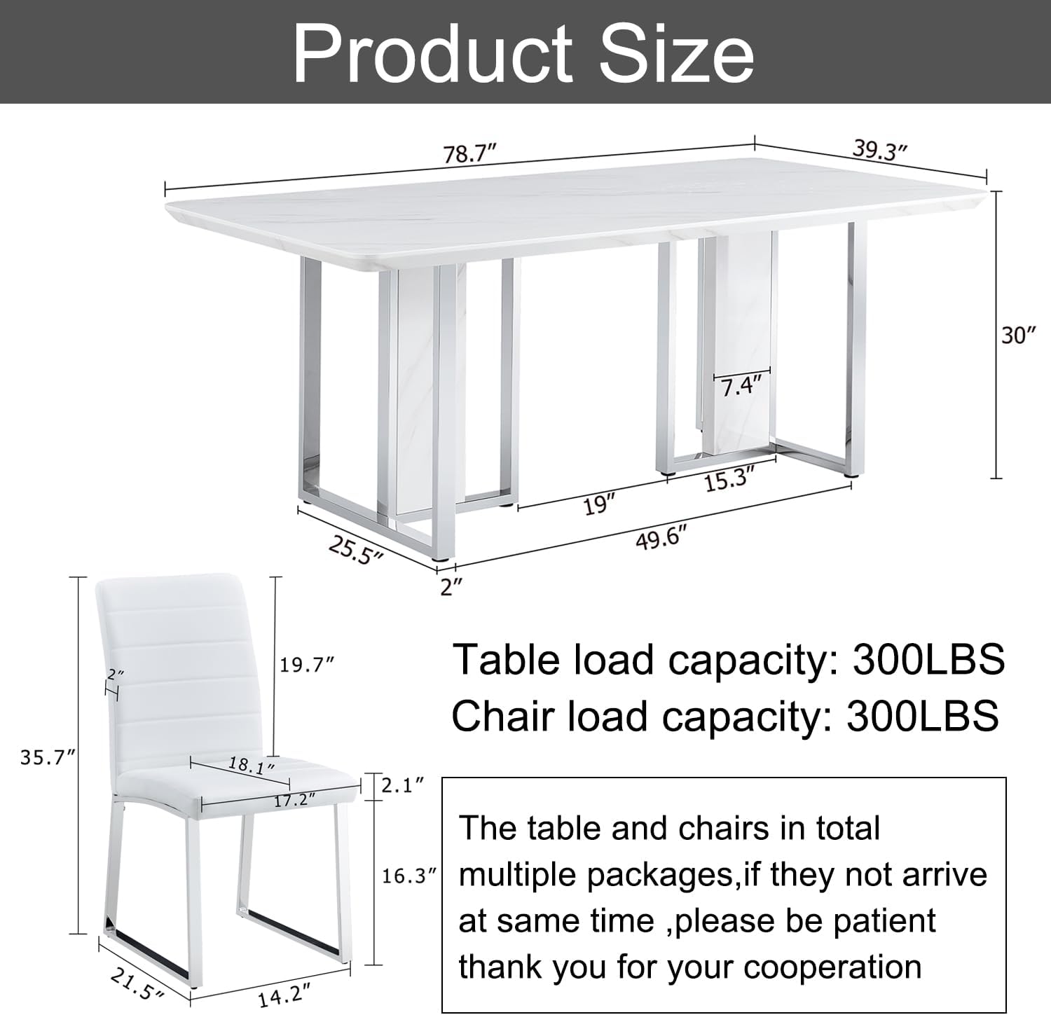 Overall Size of Dining Table Set: Table Size: 78.7-inch L x 39.3-inch W x 30-inch H; Chair Size: 14.2-inch L x 21.5-inch W x 35.7-inch H. Using the accompanying instructions and tools, the assembly process is very simple, ensuring quick and easy setup