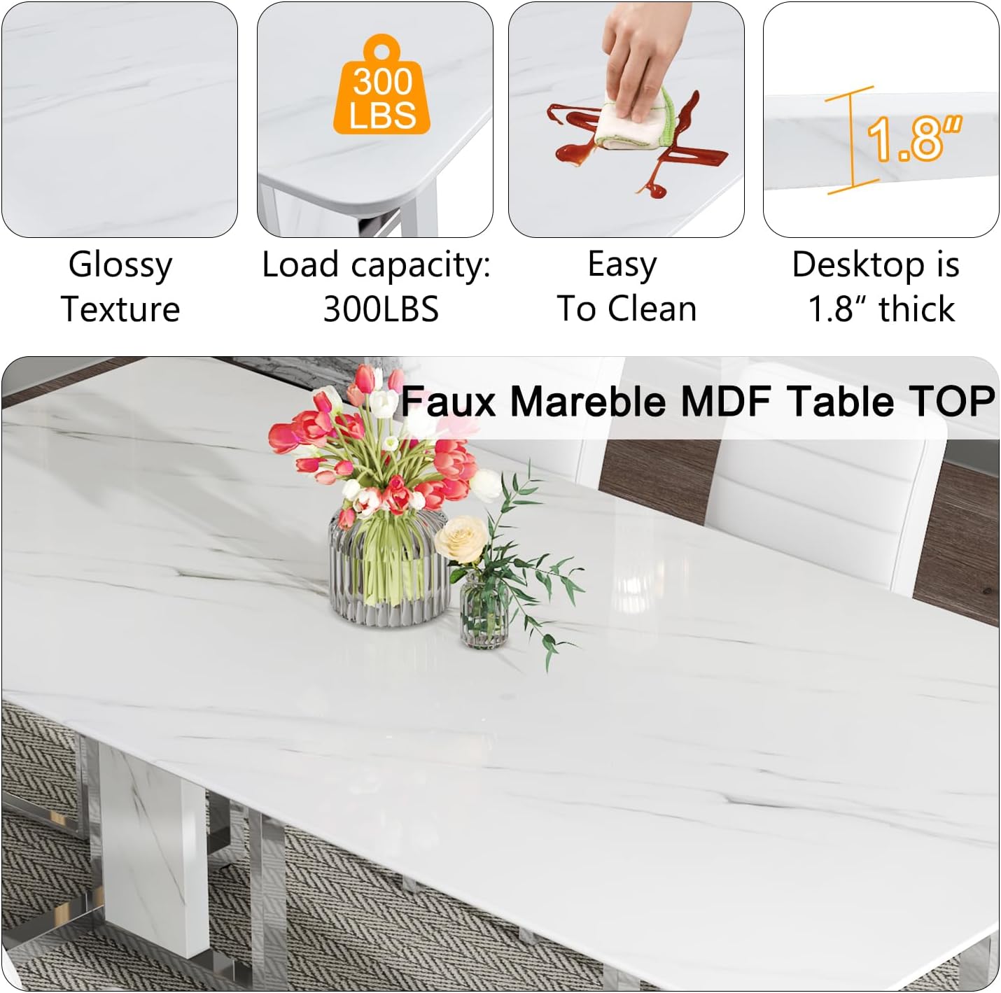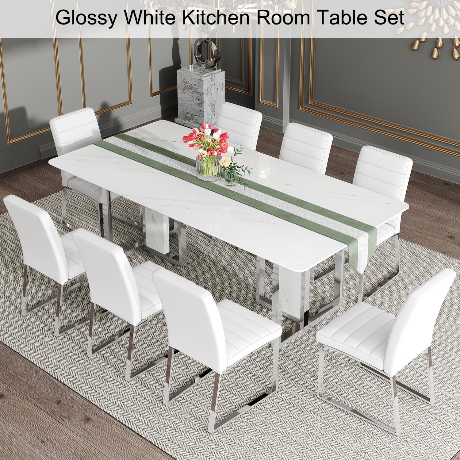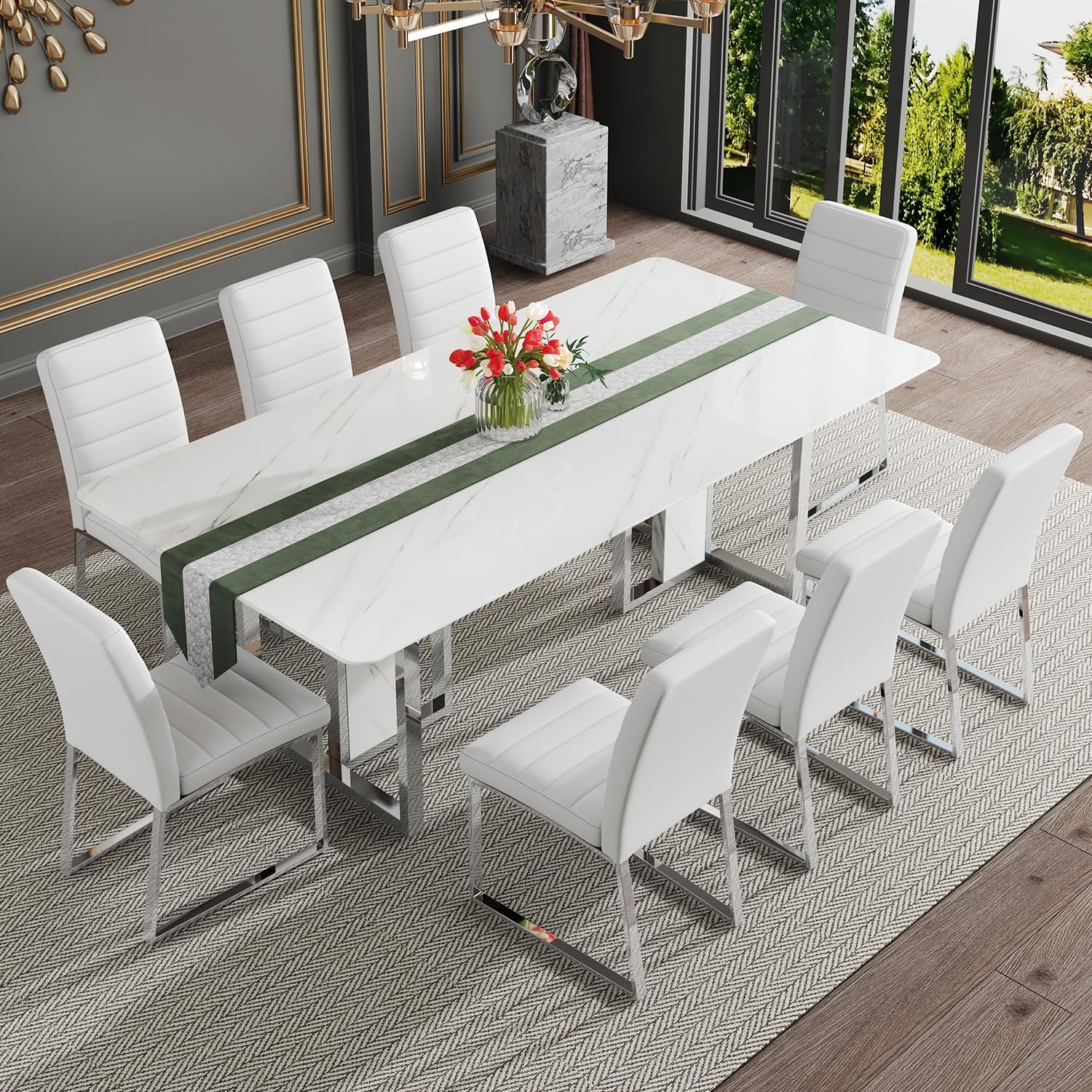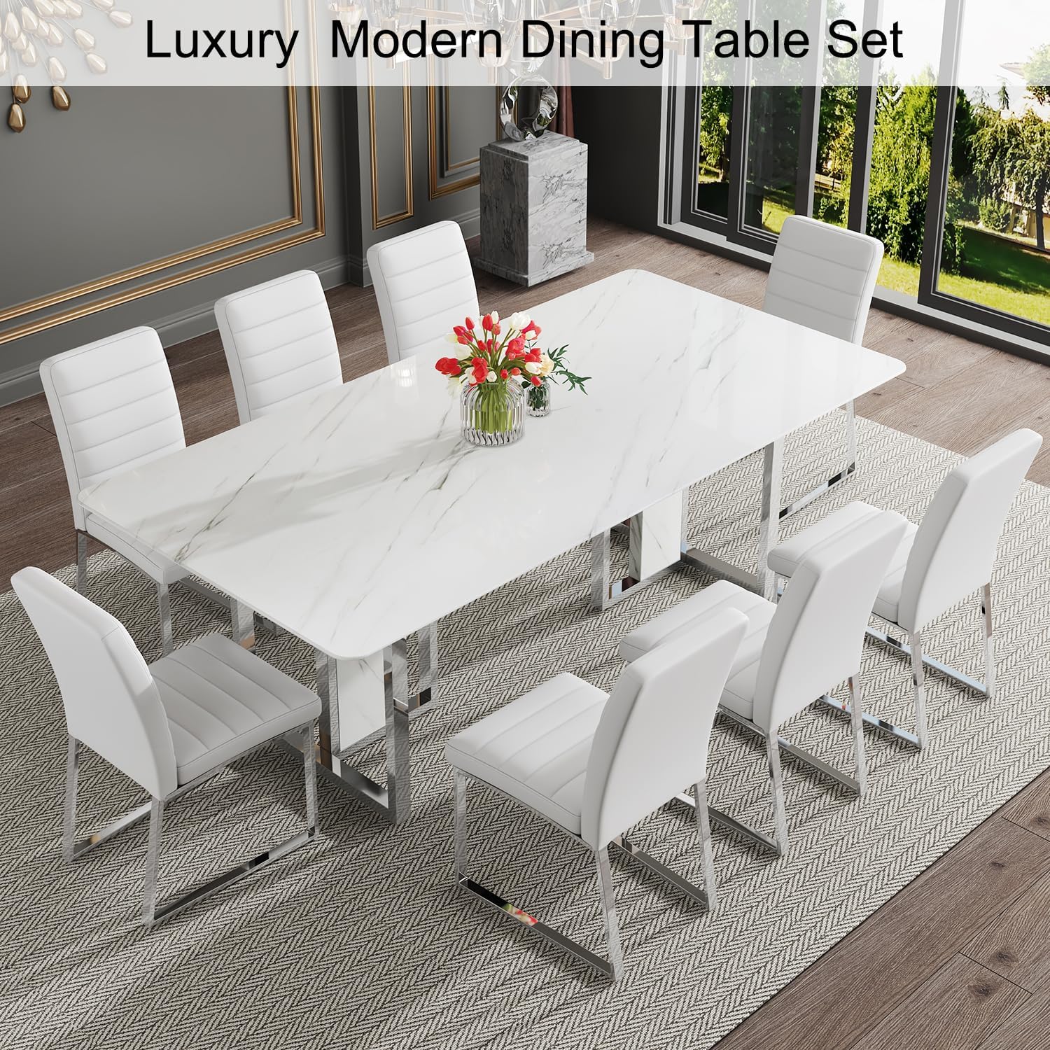 Modern Marble Dining Table Set for 8: This elegant 8-seater set features a sleek white faux marble table with 8 comfortable PU leather chairs. With a tabletop thickness of 1.8 inch, this marble dining table offers both durability and sophistication