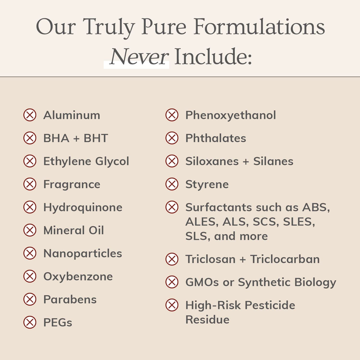 OUR PROMISE: All our products are free of toxic chemicals, colors and fragrances. Everything in our products is on our labels; and are sustainably packaged, cruelty-free certified by Leaping Bunny, non-GMO, Made Safe Certified and made in the U.S.A.