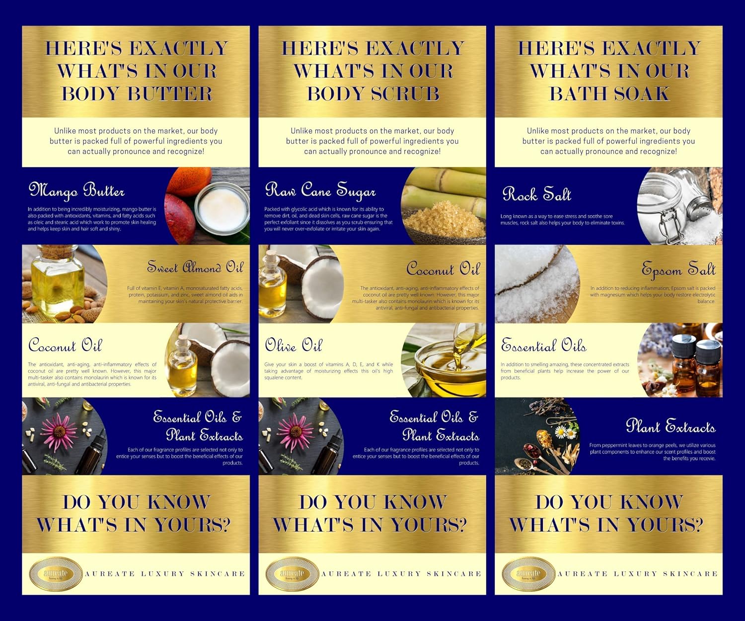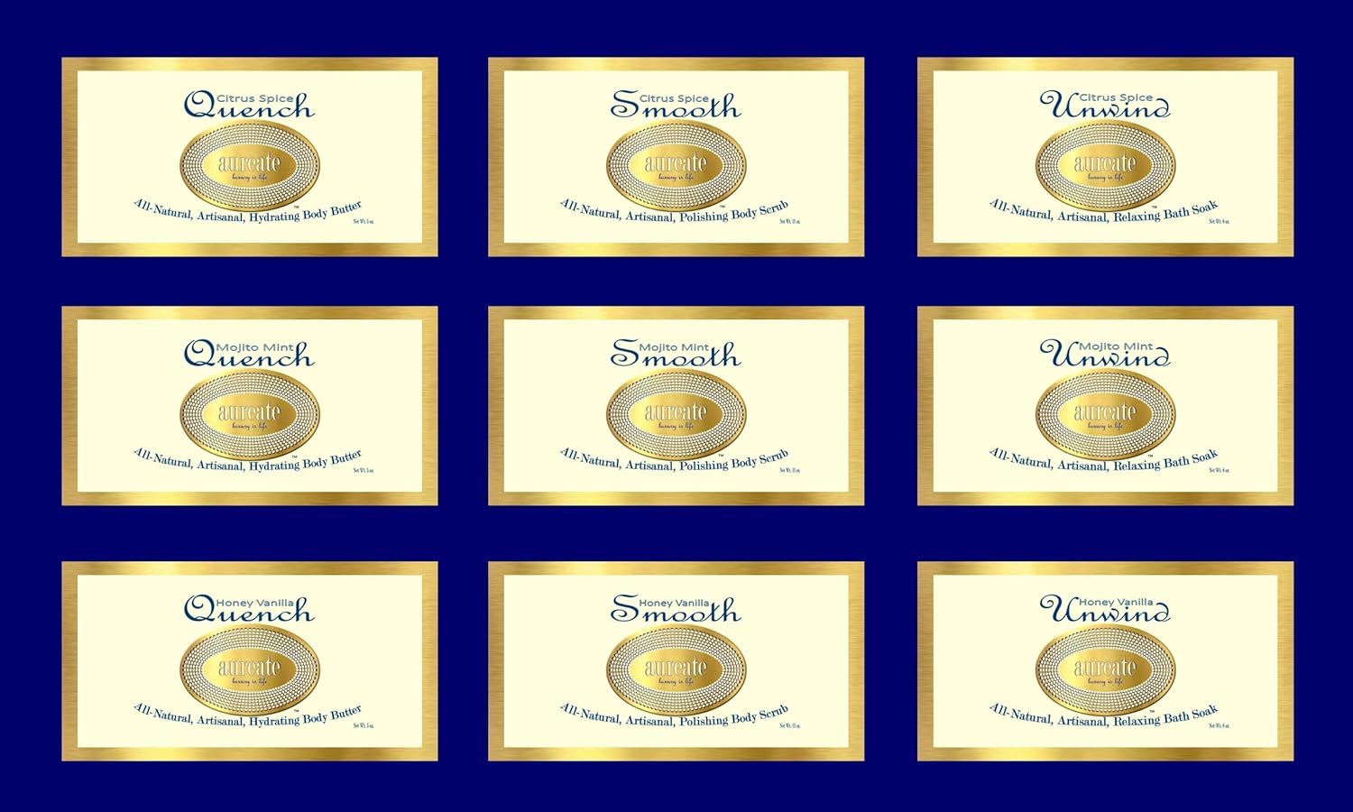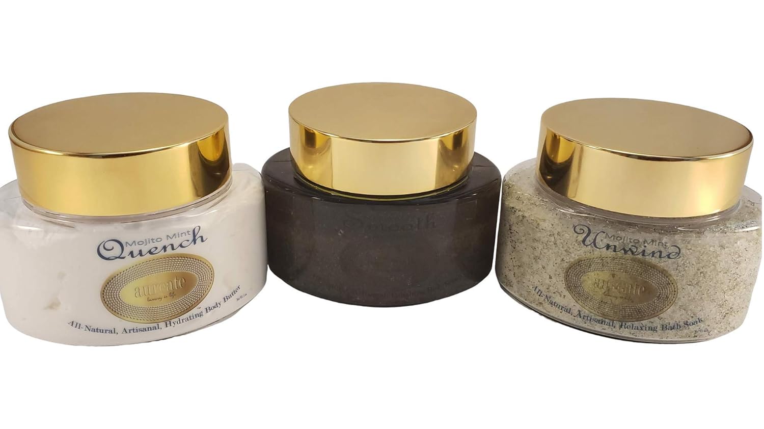 Aureate Luxury Skincare Full-Sized Luxury Product Trios, QUENCH Hydrating Body Butter, SMOOTH Polishing Body Scrub and UNWIND Relaxing Bath Soak, All-Natural, Small-Batched, Handmade Body Products
