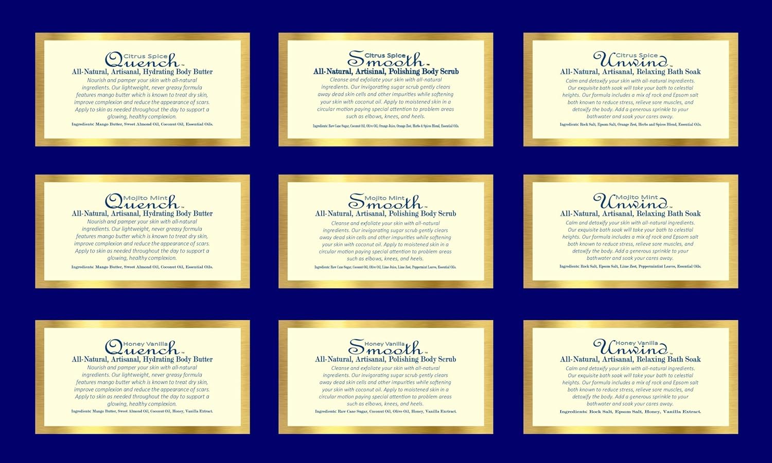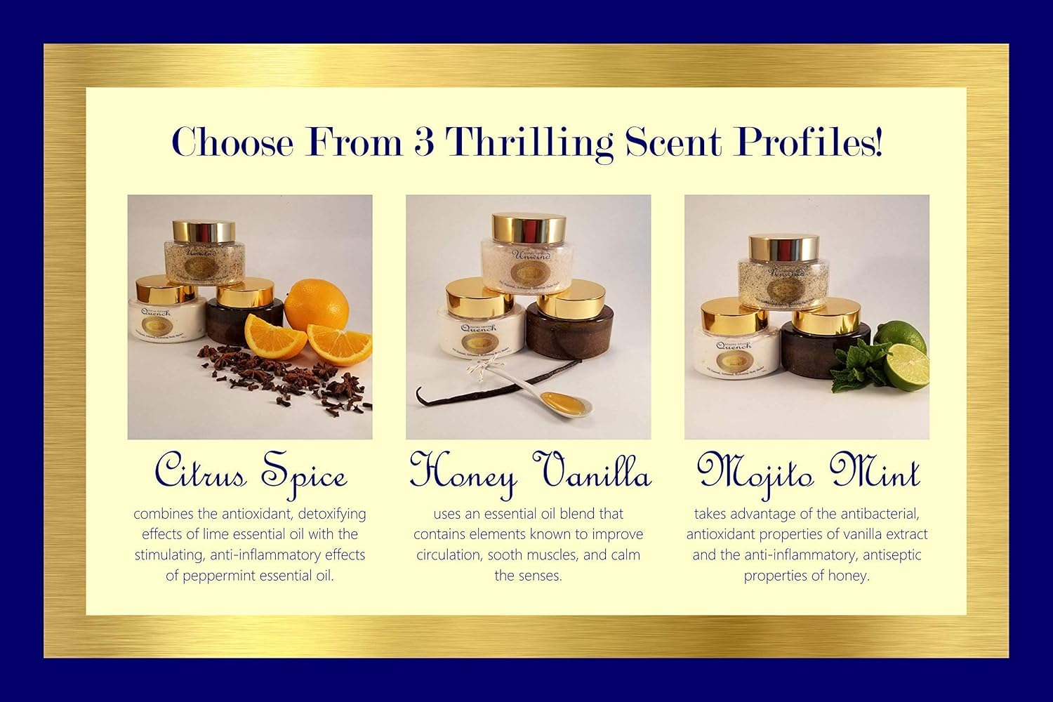 ⭐ALL THREE PRODUCTS + YOUR CHOICE OF SCENT = A GREAT DEAL! Our product trio is a great way to get full-sized jars of Quench Hydrating Body Butter, Smooth Polishing Body Scrub, and Unwind Relaxing Bath Soak in your choice of Mojito Mint, Citrus Spice, or Honey Vanilla while saving ten percent off your total purchase (compared to buying them individually).