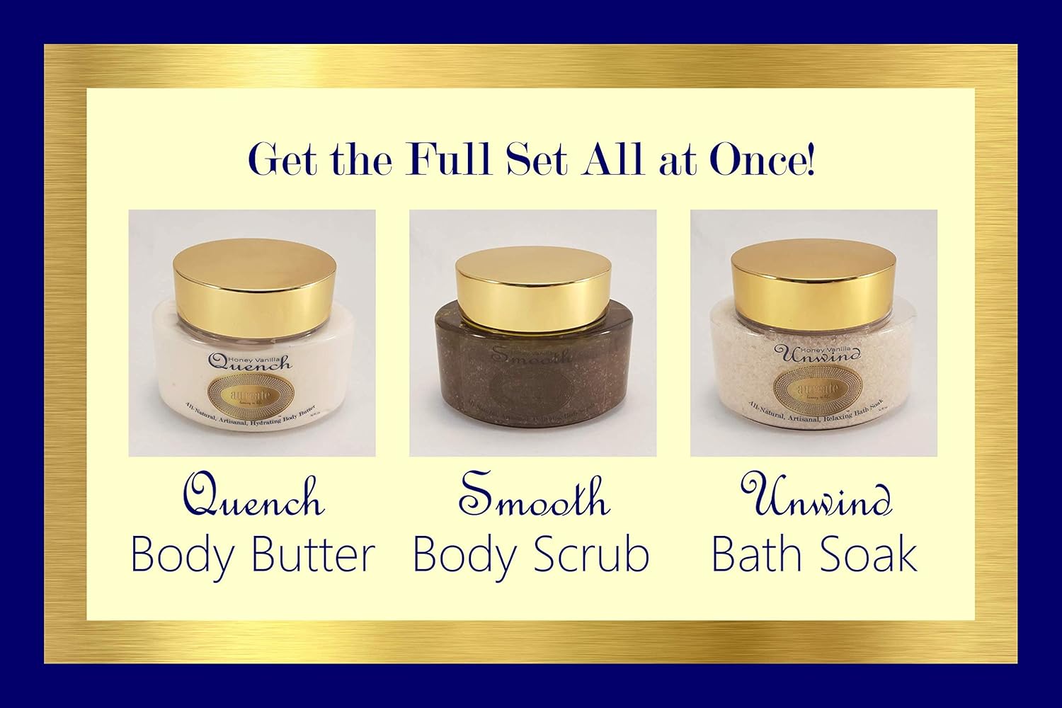 Be the first to review “Aureate Luxury Skincare Full-Sized Luxury Product Trios, QUENCH Hydrating Body Butter, SMOOTH Polishing Body Scrub and UNWIND Relaxing Bath Soak, All-Natural, Small-Batched, Handmade Body Products”