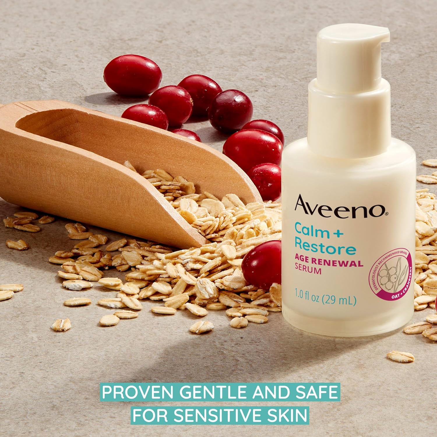 1-fluid ounce bottle of Aveeno Calm + Restore Age Renewal Face serum, anti-aging serum for sensitive skin with nourishing oat & cranberry extract to visibly improve the look of fine lines & wrinkles