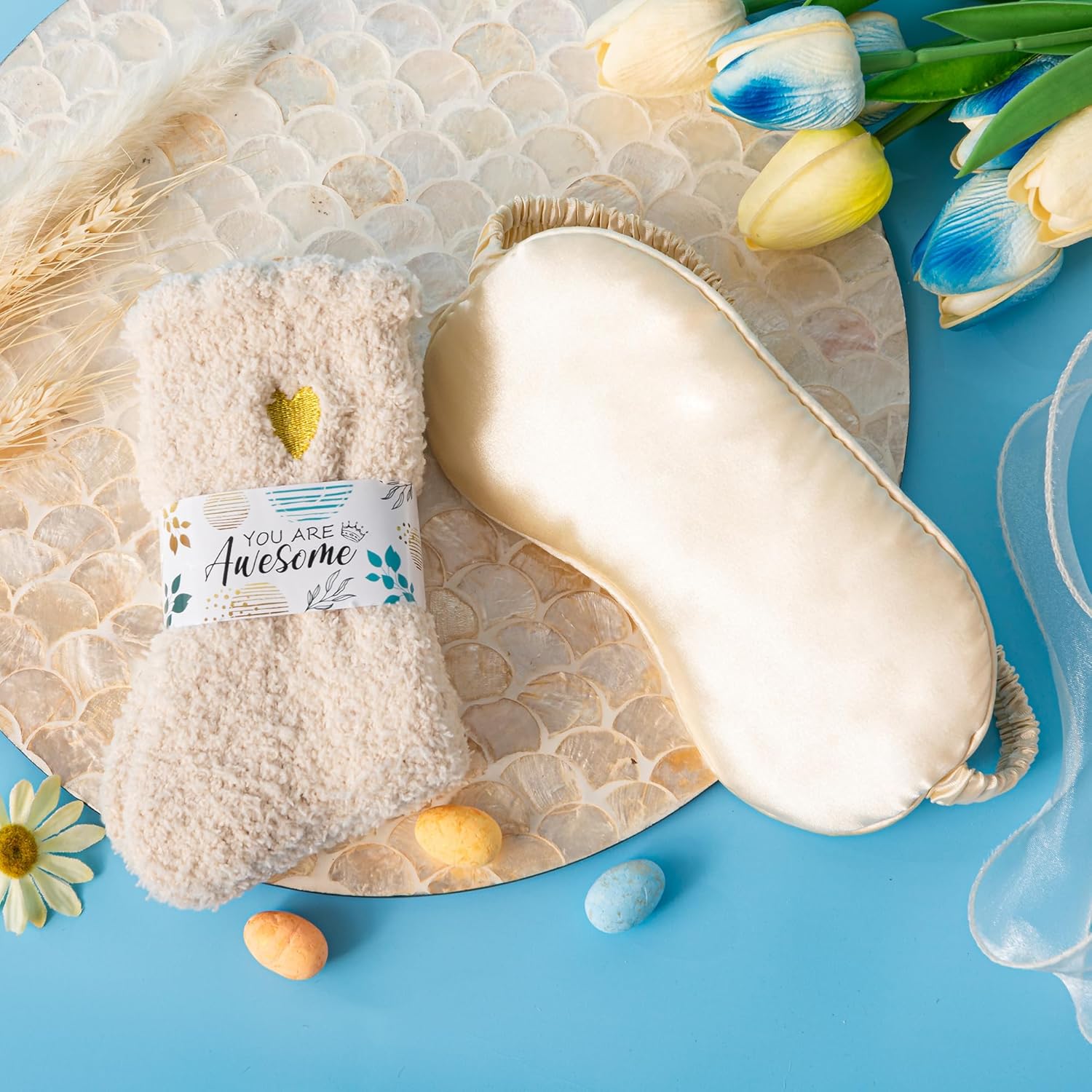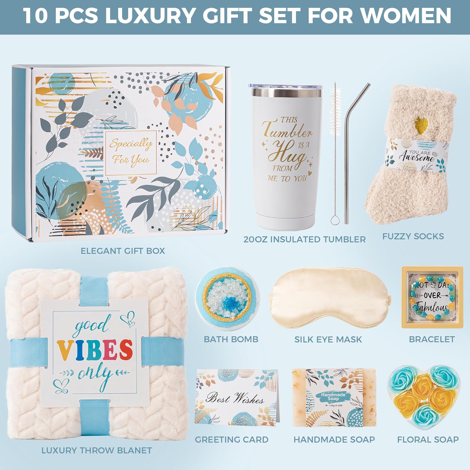 Gift For Women Who Have Everything: This gorgeous birthday gift set includes 10 thoughtfully curated items:1*20oz Insulated tumbler (with stainless steel straw and straw brush),1* throw blanket,1* warm socks,1* bath bomb,1* handmade soap,1* f1oral scented soap,1* silk eye mask,1* natural stone bracelet,1* elegant gift card,1* exquisite gift box.This thoughtfully curated basket is designed to wrap your loved ones in care and coziness. Each item has been carefully selected to deliver comfort, joy, and heartfelt support – like sending a warm hug through gifts