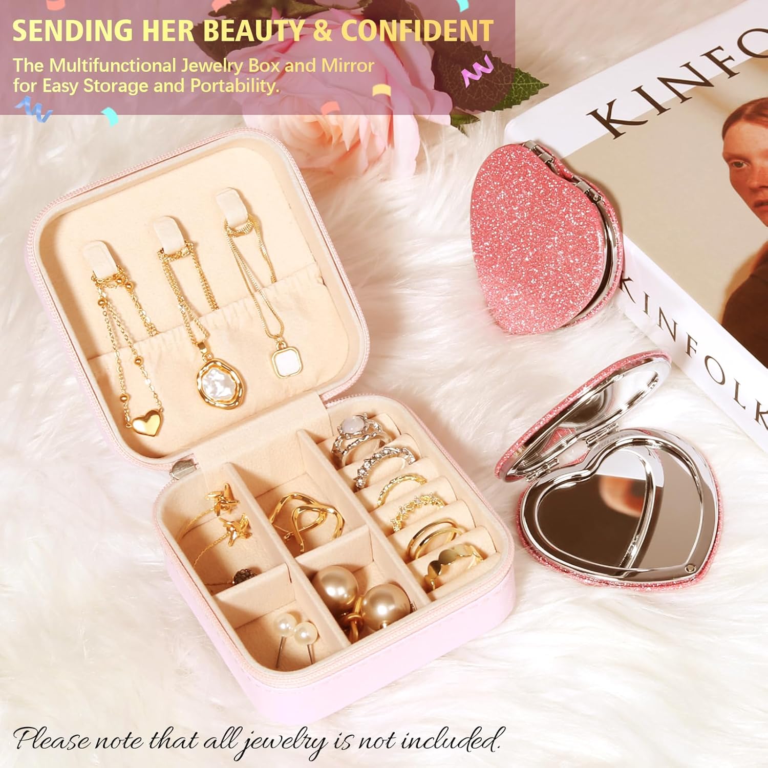 LUXURY JEWELRY BOX AND HEART-SHAPED MIRROR: The perfect sized Jewelry box with different sections to store any jewellery (Please note that all jewelry is not included), and the mini mirror is for checking her makeup anytime is anywhere and stay sophisticated. Let her know how beautiful she is, celebrate her birthday with your touching love and care and brighten her special day!