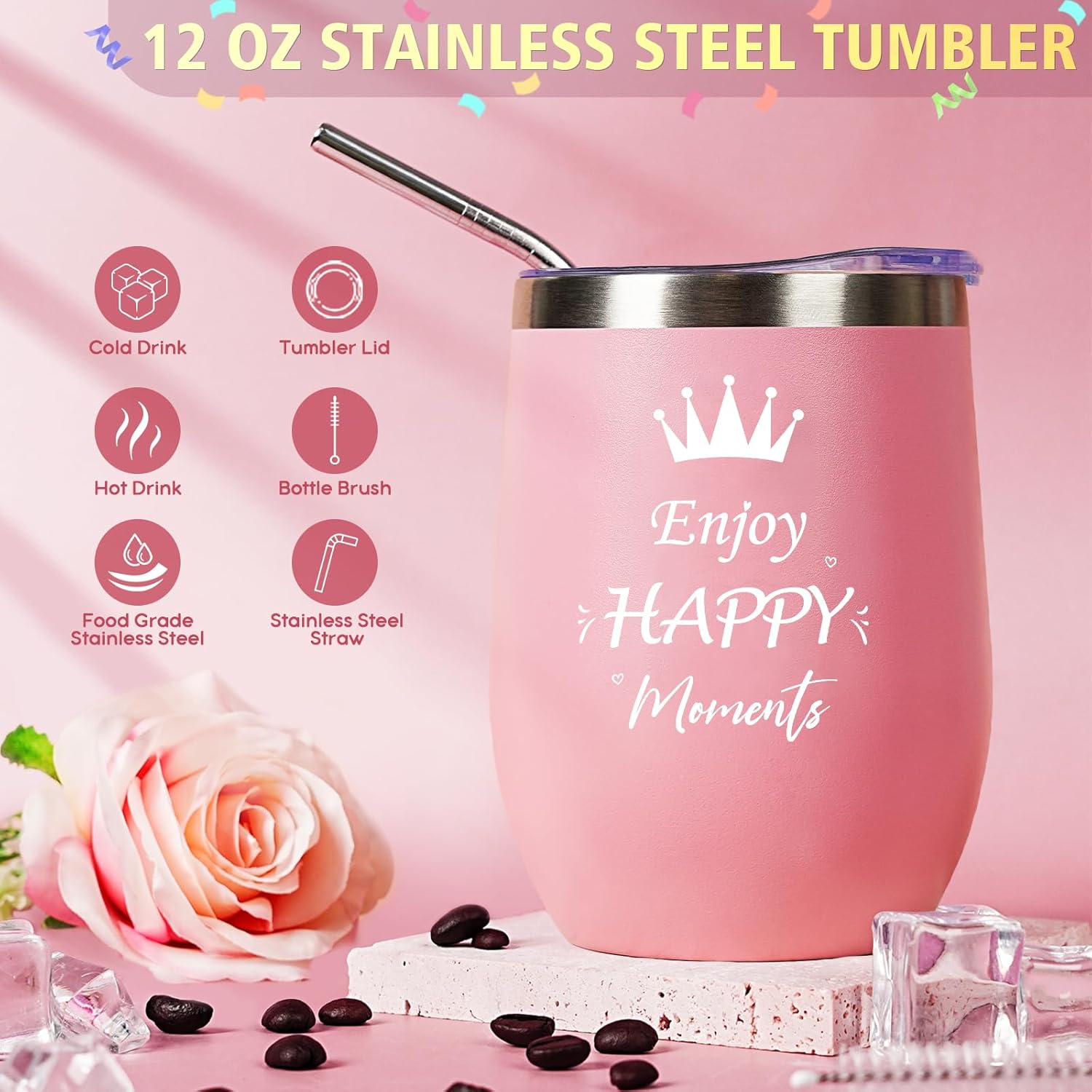 CUSTOMIZED TUMBLER FOR HER COZY MOMENTS: Gift her our unique tumbler with the specialized message “Enjoy Happy Moments.” Our 12oz tumbler is made of vacuum insulated Stainless Steel, it keeps drinks cold for 8 hours and hot for 4, also includes a straw and cleaning brush for convenience. Perfect to enjoy her favorite tea or iced drink, it’s sure to surprise and delight her at first sight!