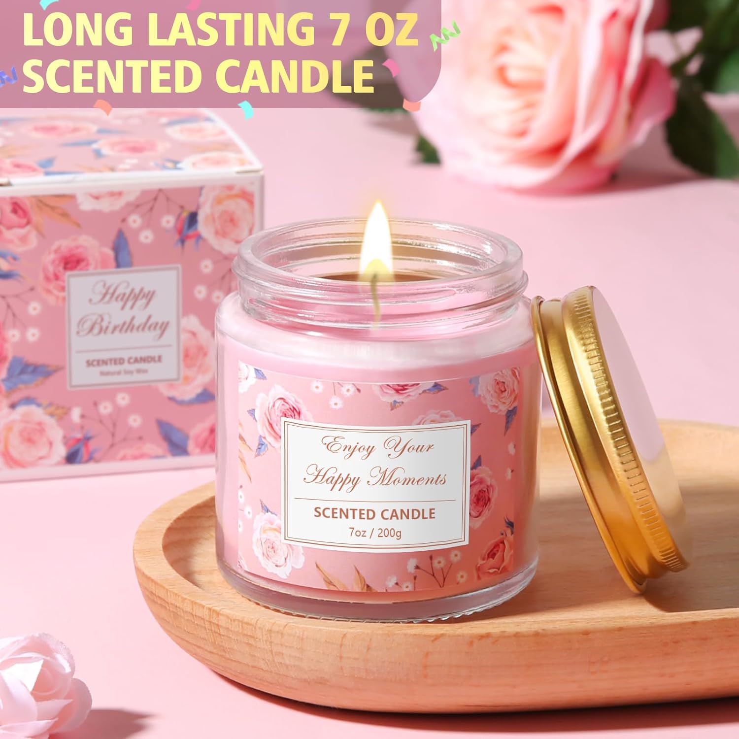 7OZ LONG LASTING SCENTED CANDLE: Our 7oz nontoxic pure plant rose essential oil candle, crafted from natural soy wax, burns smoke-free and provides up to 50 hours of long-lasting rose fragrance. Elegant scent will linger even after the candle is crushed out. The 7oz rose scented candle offers her a relaxing sleep or bath experience at home, get this birthday box with the luxurious candle to give her a touching birthday celebration.