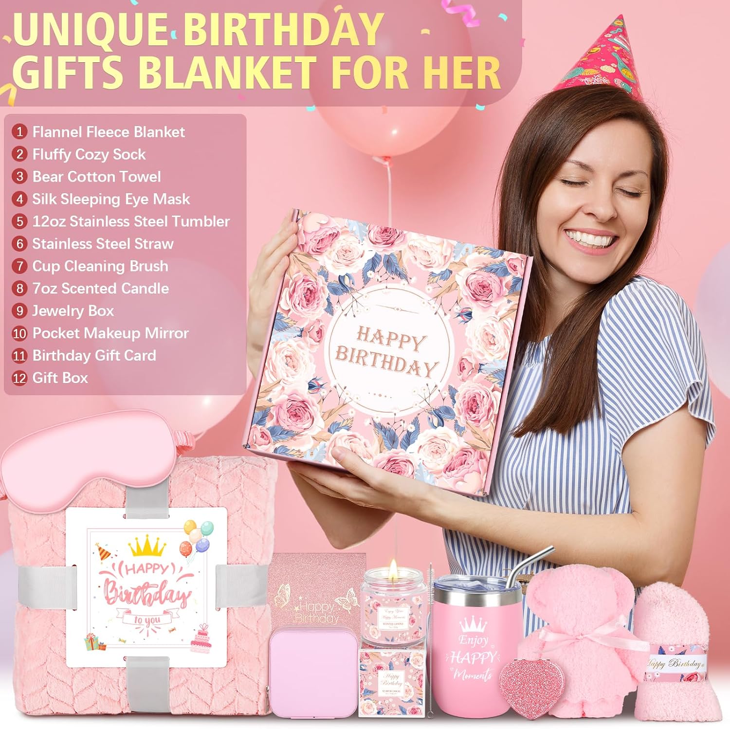 UNIQUE BIRTHDAY GIFT BASKET FOR WOMEN: Our gift sets for women birthday are exquisitely wrapped with blanket, candle, socks, little bear towel, tumbler, straw, brush, eye mask, jewelry box, mirror, greeting card, gift box. Each piece within the gift box is carefully curated with birthday-themed. Making it an ideal choice to your mother, sister adult, wife, girlfriend, female best friend, coworker, bestie, bff, daughter in law, aunt, teacher, or any exceptional lady.