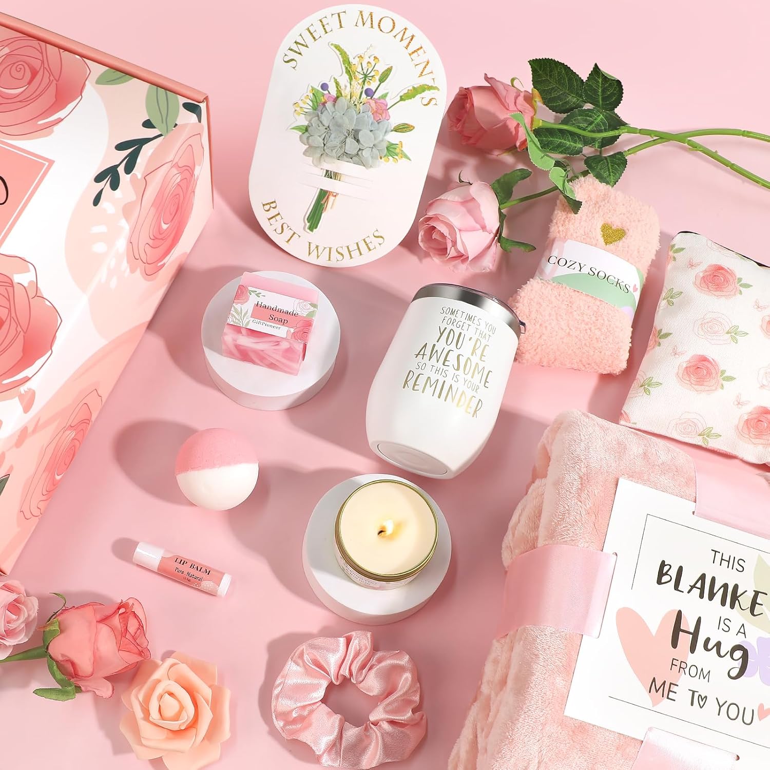 THOUGHTFUL SELF-CARE GIFT: Show your love and support with this carefully curated care package. This package includes a flannel blanket, 12oz stainless steel cup, plush socks, scented candle, soap, bath bomb, lip balm, makeup bag, silk hair band, dried flower gift card. Each item has been carefully selected to add peace and joy to life in a soft and refreshing way. Such a heartwarming birthday gift for girls is unique! Give this spa gift to women and let her enjoy a cozy and relaxing time