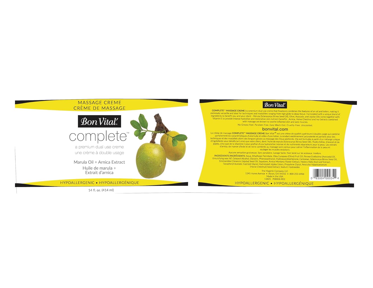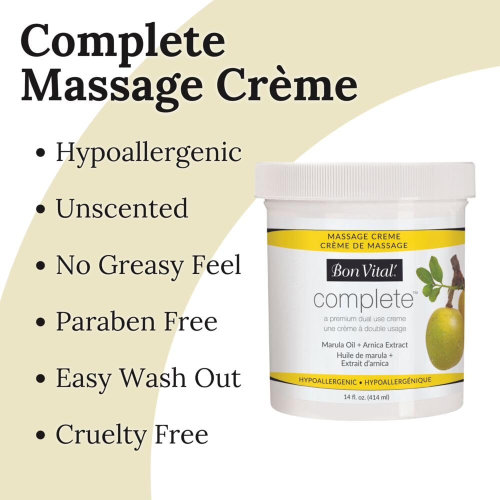 Bon Vital, the #1 preferred brand of massage therapists focusing on professional quality products, brings you a premium dual use massage cr�me designed to provide ultimate versatility and healthy skin therapeutic benefits for all massage modalities and techniques. The Bon Vital� Complete Massage Cr�me leverages the restorative and moisturizing powers of Marula, Olive, Avocado, and Jojoba Oils coupled with the anti-inflammatory and calming effects of Arnica, Horse Chestnut, and Ivy Extracts. The unscented formula is ideal for blending with Bon Vital� essential oils to create the ultimate aromatherapy massage experience.