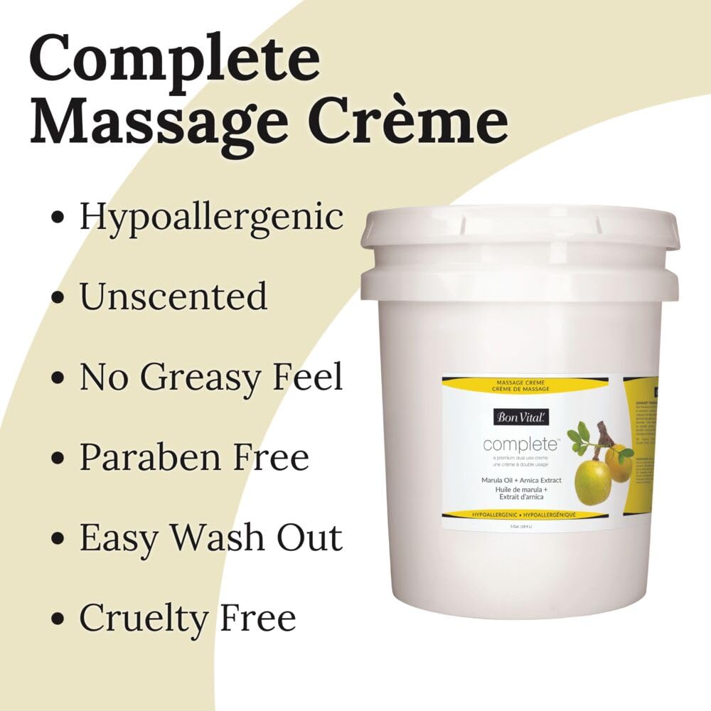 Bon Vital Complete Massage Creme, Premium Dual Use Cream for Hypoallergenic Professional Massages, Non Greasy Unscented Moisturizer Made with Marula, Olive, Avocado, & Jojoba Oil, 5 Gallons