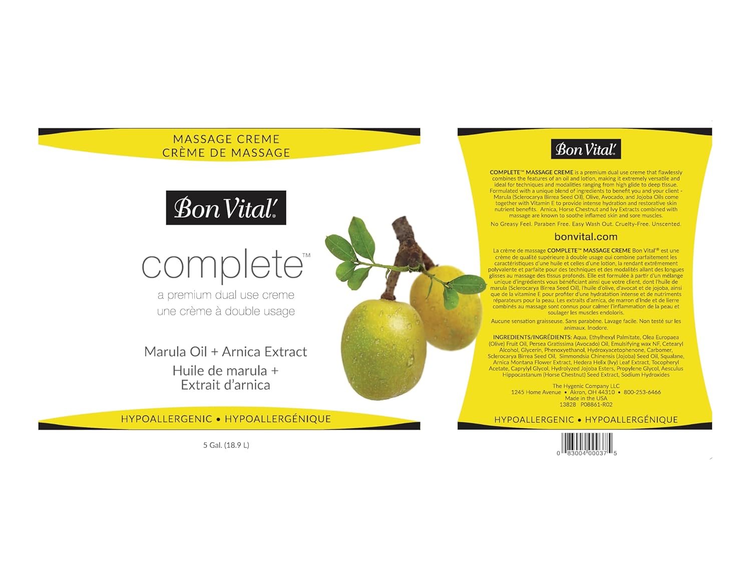 Bon Vital, the #1 preferred brand of massage therapists focusing on professional quality products, brings you a premium dual use massage cr�me designed to provide ultimate versatility and healthy skin therapeutic benefits for all massage modalities and techniques. The Bon Vital� Complete Massage Cr�me leverages the restorative and moisturizing powers of Marula, Olive, Avocado, and Jojoba Oils coupled with the anti-inflammatory and calming effects of Arnica, Horse Chestnut, and Ivy Extracts. The unscented formula is ideal for blending with Bon Vital� essential oils to create the ultimate aromatherapy massage experience.