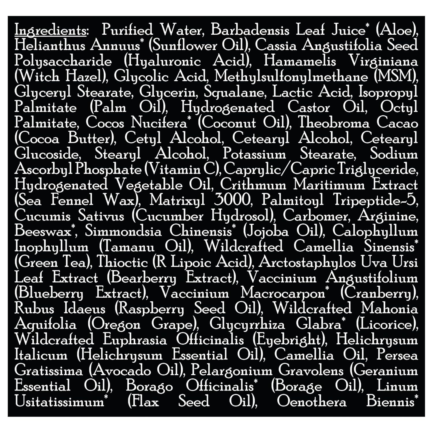 Key Ingredients: Natural & Organic ingredients, including aloe, protein peptides, MSM, hyaluronic acid, vitamin C, and green tea.