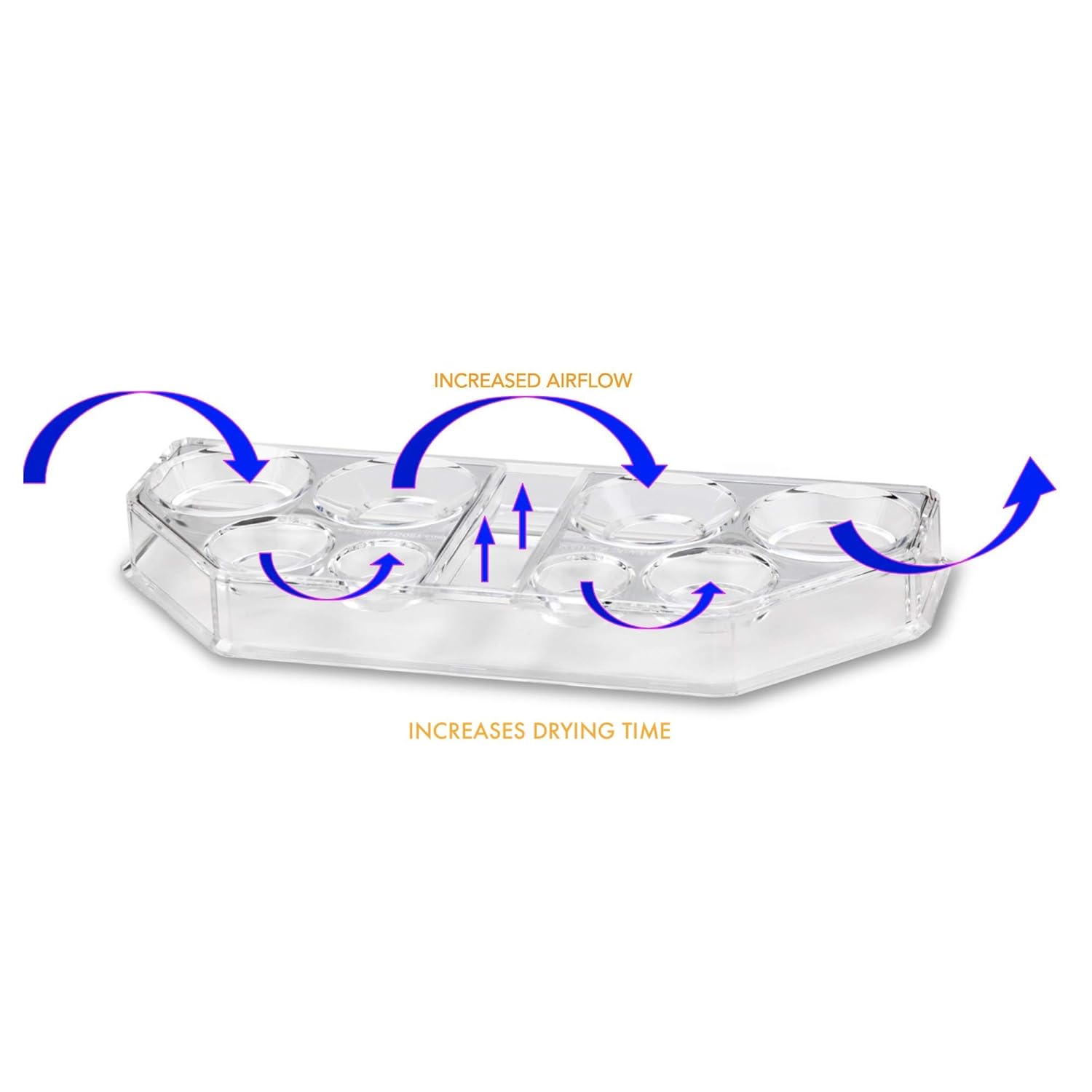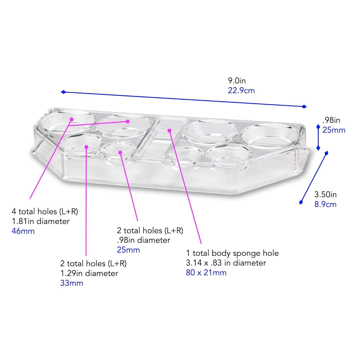 Made from a single piece with no glued piecesMade of crystalline acrylic mimicking the look of glassBeveled holes contour to wet & dry spongesReduces bathroom counter & studio vanity clutterIncreases the quality, life & longevity of your spongesAccess & see your beauty sponges quicklyFaster drying time for quicker sponge re-use
