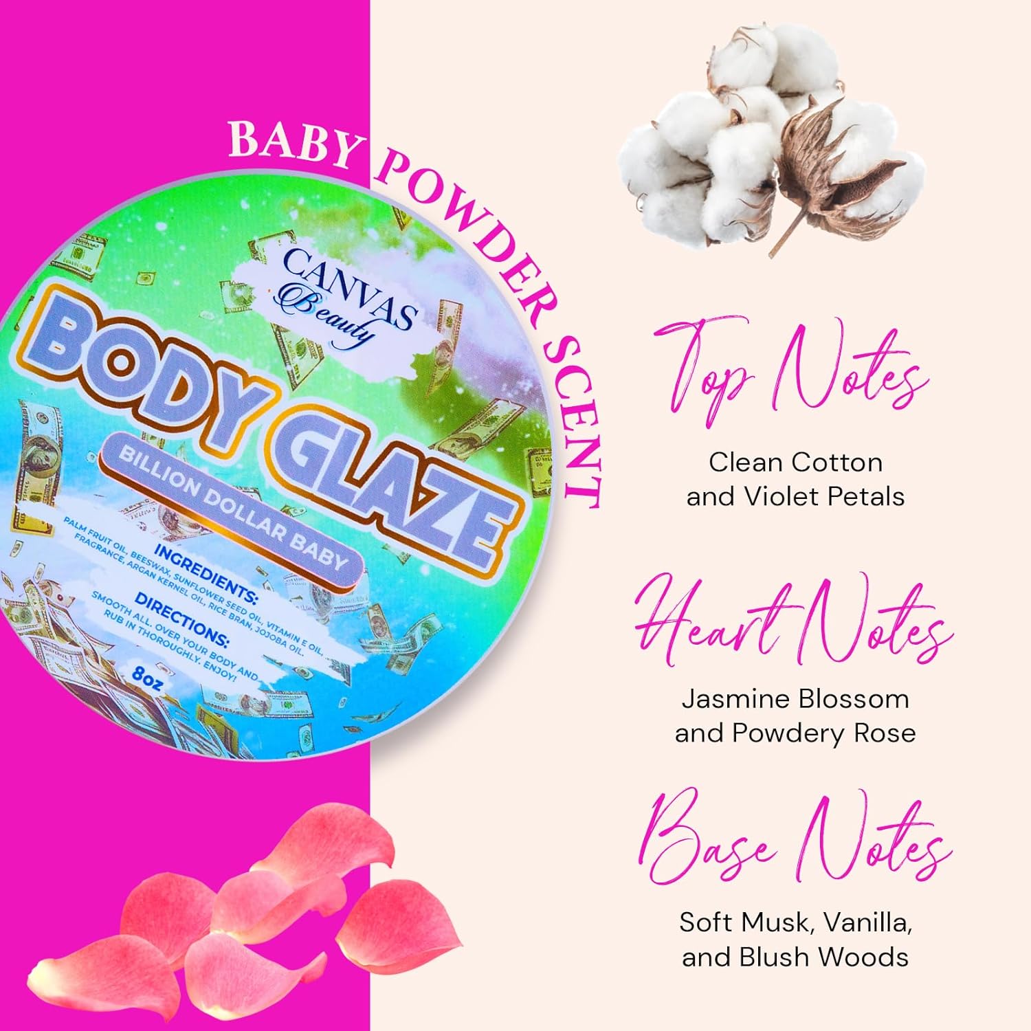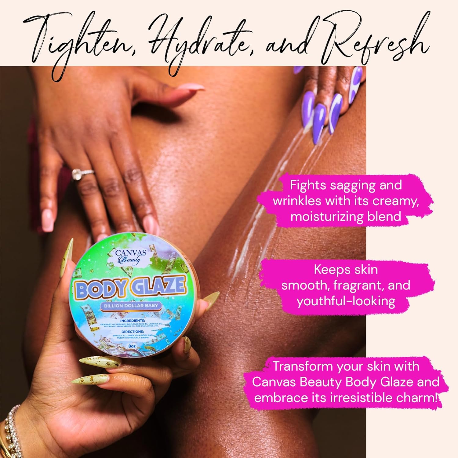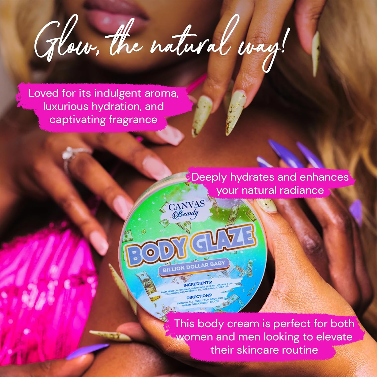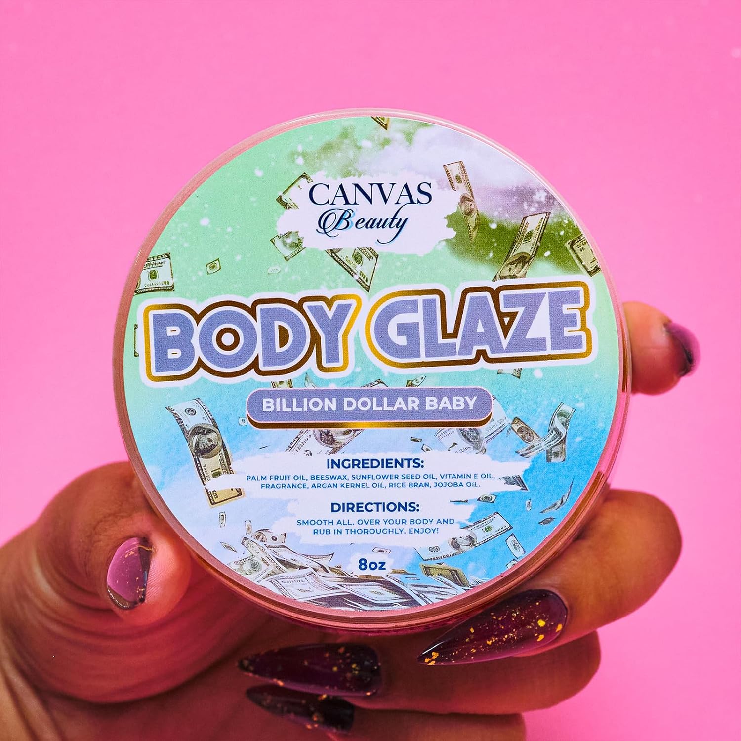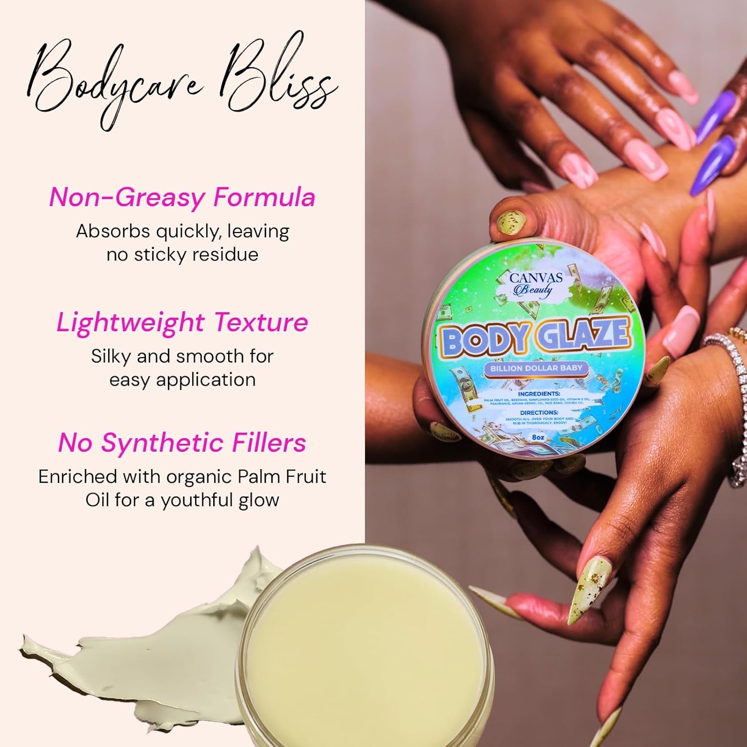 Treat your skin to the ultimate indulgence with Canvas Beauty Body Glaze: Billion Dollar Baby —a luxurious, non-greasy body butter that delivers deep hydration and a scent so fresh and elegant. This fan-favorite formula combines effective skincare with an irresistible fragrance, leaving your skin soft, smooth, and glowing from head to toe. Infused with a blend of Clean Cotton, Violet Petals, Jasmine Blossom, Powdery Rose, Soft Musk and Vanilla, this whipped body butter wraps your body in a fresh aroma that lingers all day. Whether you’re starting your day or winding down, this elegant scent creates a self-care experience you’ll look forward to every time. But the benefits go far beyond fragrance. Our body glaze is enriched with organic Palm Fruit Oil, a powerful ingredient that helps restore skin’s youthful appearance while locking in moisture. Combined with nourishing ingredients like Beeswax, Jojoba Oil, and Rice Bran, this body butter delivers long-lasting hydration, visibly improves skin texture, and promotes elasticity—making it ideal for dry, dull, or aging skin. The whipped, silky texture melts into your skin on contact, providing a smooth, non-greasy finish that won’t clog pores or leave residue. It’s perfect for daily use and gentle enough for all skin types. With consistent use, you’ll notice firmer, more radiant skin that smells just as good as it feels. Whether you’re treating yourself or looking for the perfect gift, Canvas Beauty Body Glaze: Billion Dollar Baby is a must-have addition to your body care routine. Join thousands who have fallen in love with the viral glaze that’s taken social media by storm. Smell amazing, feel confident, and give your skin the sweet nourishment it deserves.