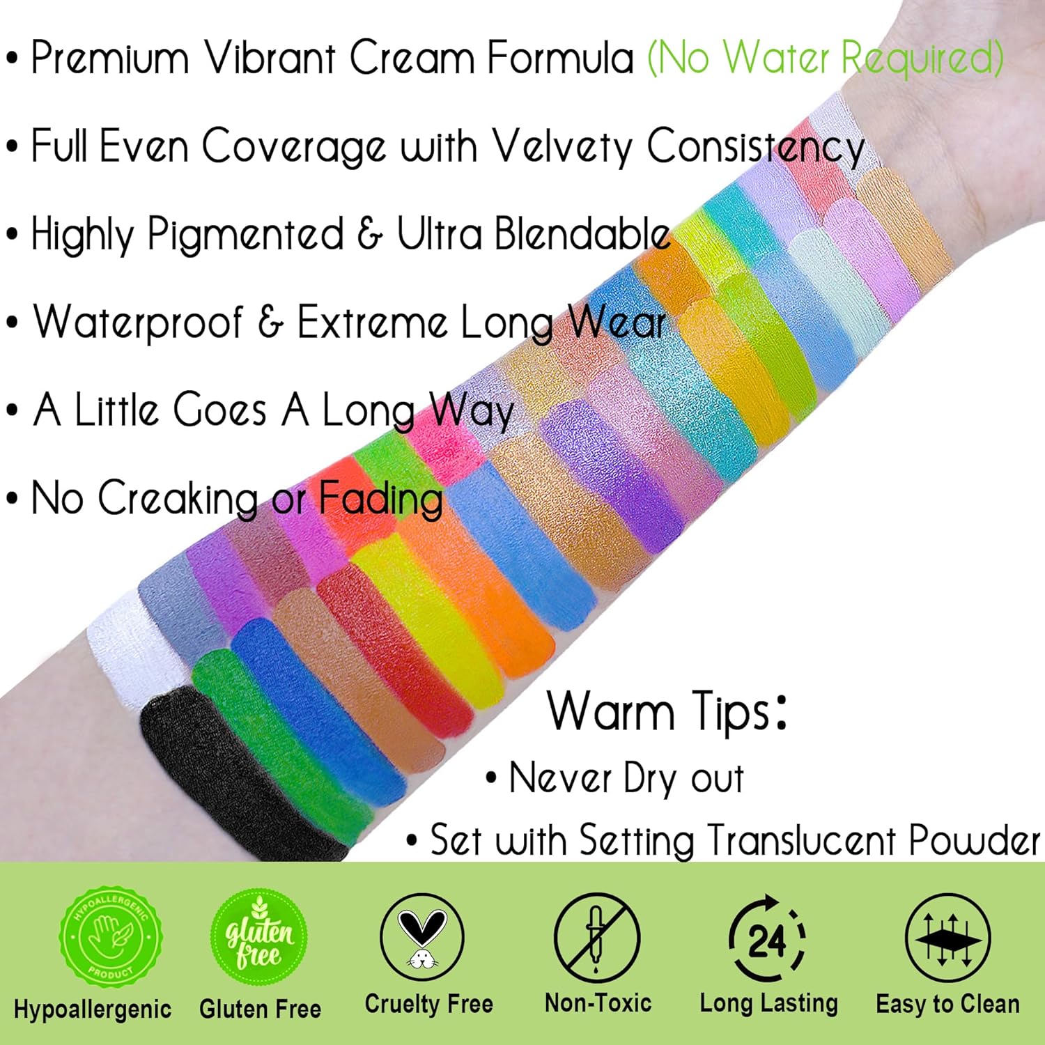NET W.T. : 280g / 9.9oz (filled Full than other brands)Gluten free, Cruelty free, VeganOil-Based semi-soft cream formula, safe and gentle on sensitive skin.Including 22 Classic vivid colors + 8 Shimmer colors + 6 UV Glow Colors which will be reactive under UV or Black light. Rich & More colors can perfectly show your endless imaginations with even one layer, or blend them to any unique colors to satisfy your various demands.
