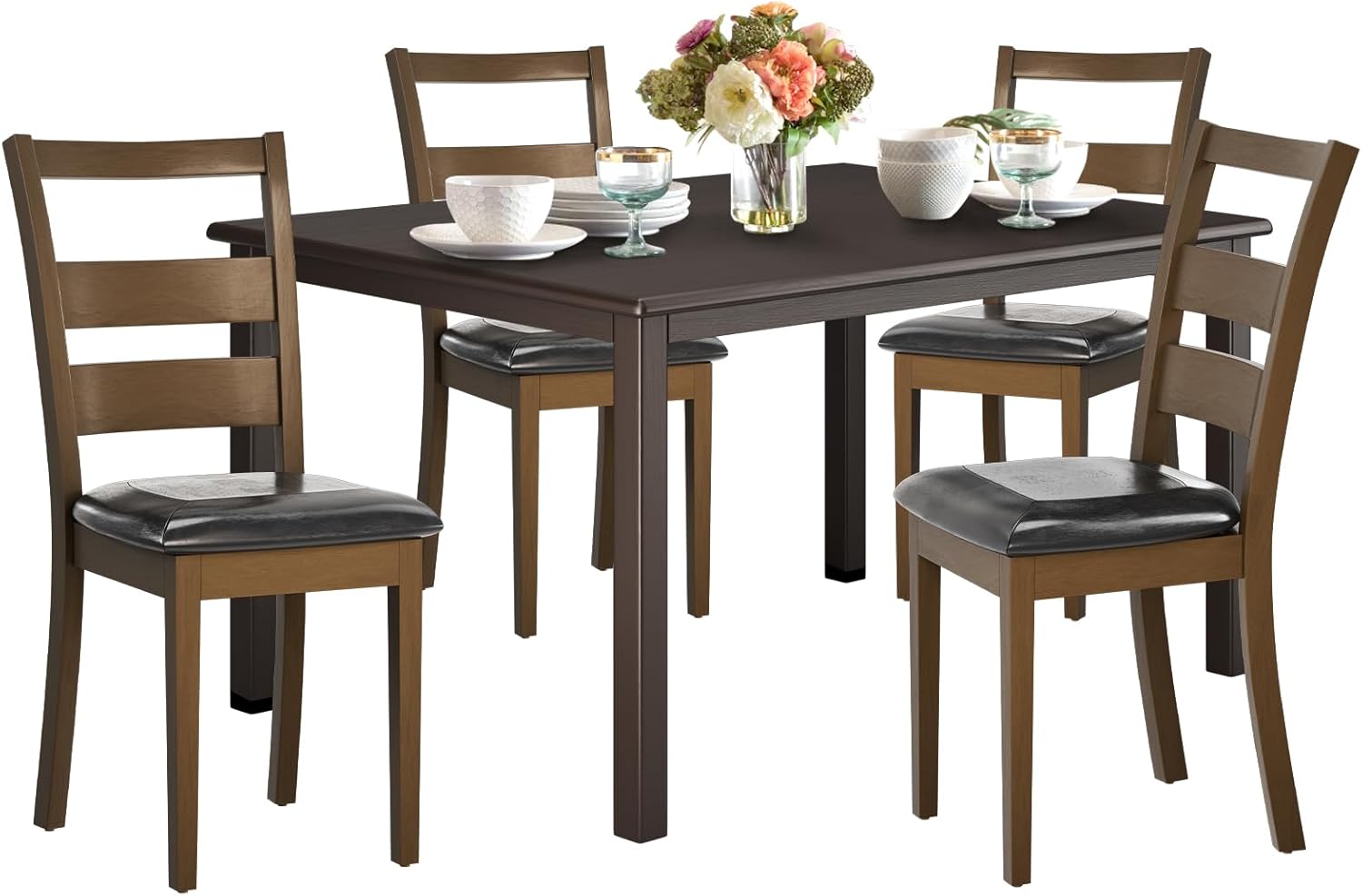 COLAMY Rectangle Wooden Dining Room Table Set for 4, Mid Century Modern Kitchen Table and PU Leather High Back Dining Room Chair for Home, Saving Space (1 Table with 4 Chairs), BlackBrown