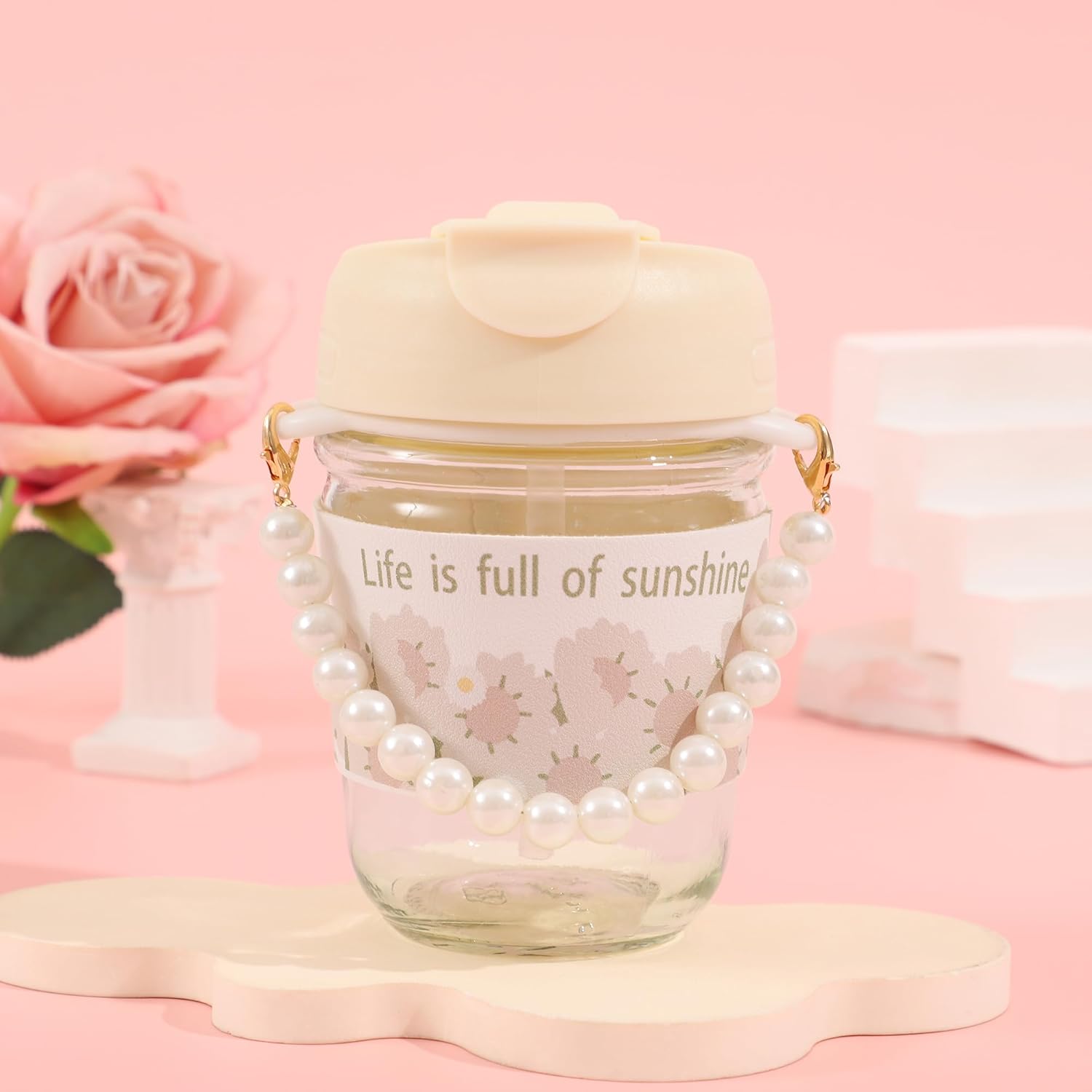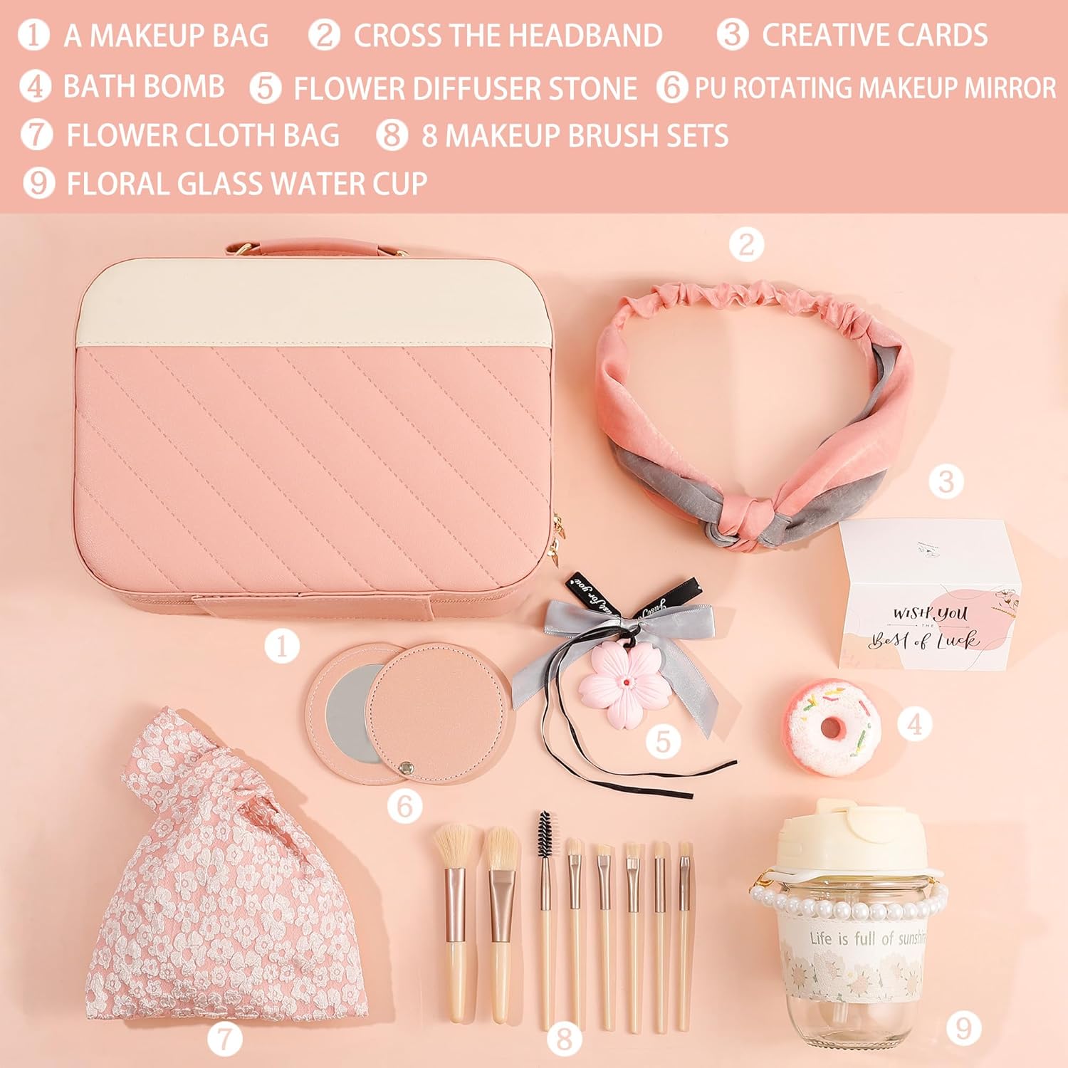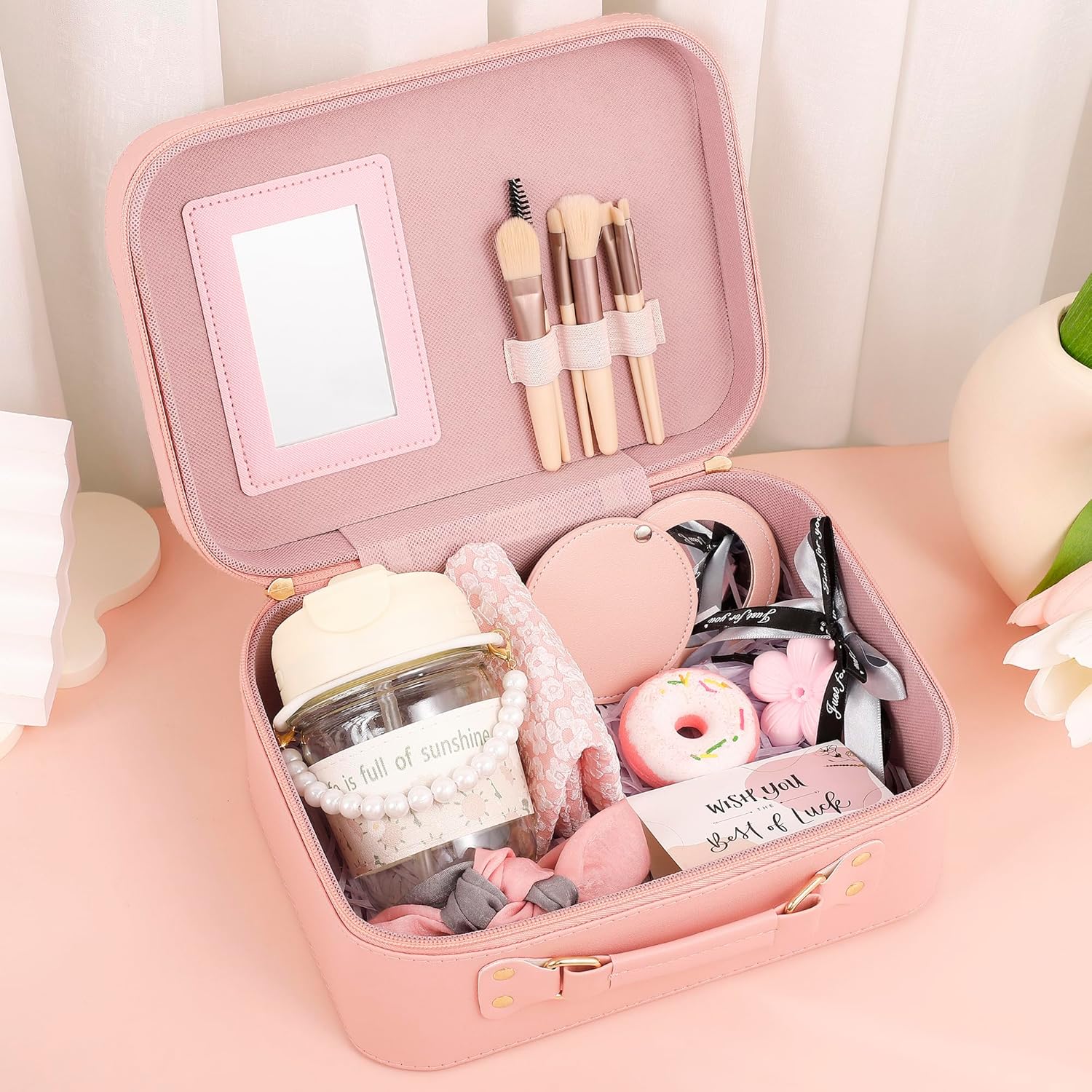 Creative and Personalized Wishes: The creative card features a warm design, allowing you to write heartfelt wishes. The flower pearl handle water cup is portable and suitable for all seasons. This makeup box gift set is not only a great gift but also enhances your happiness in daily life.