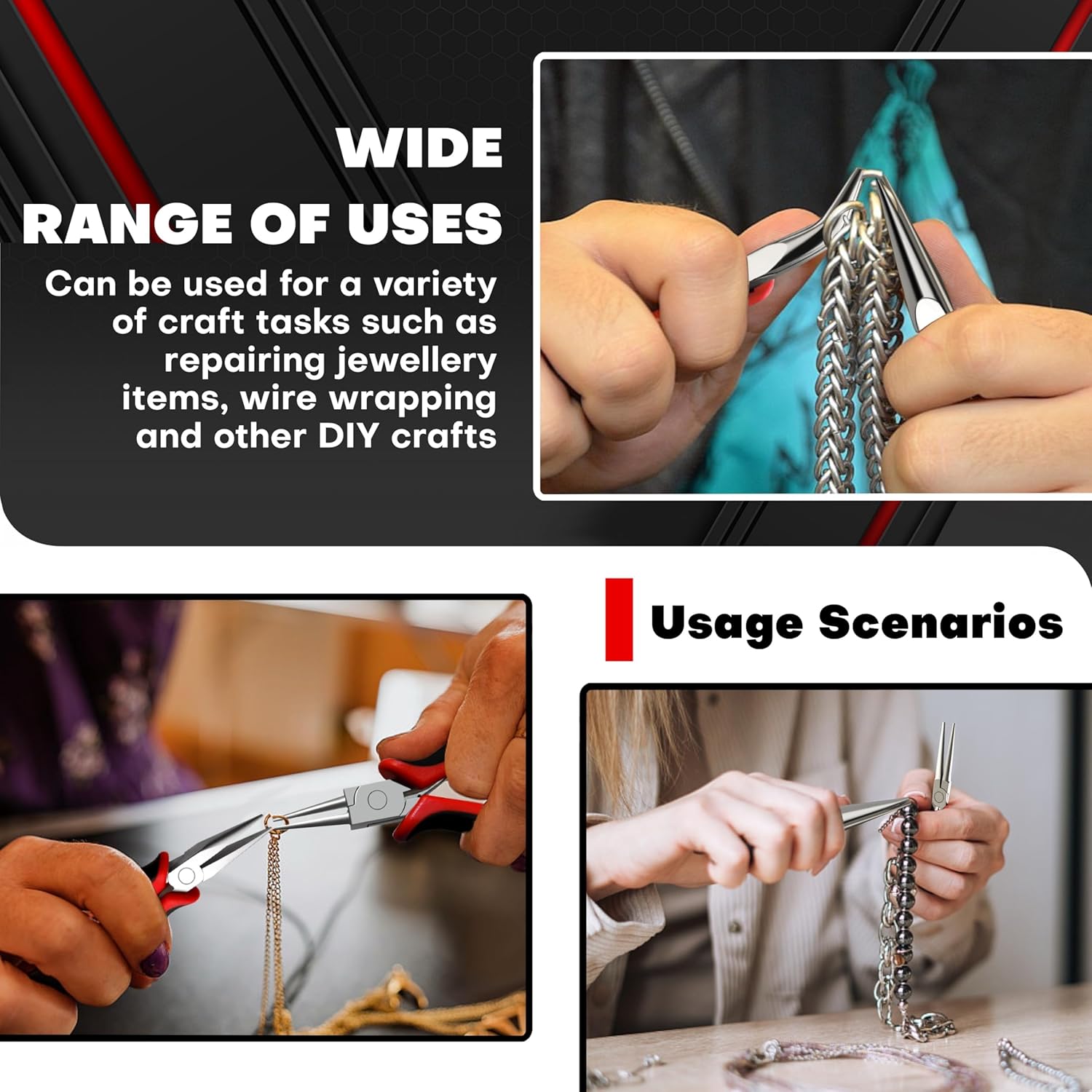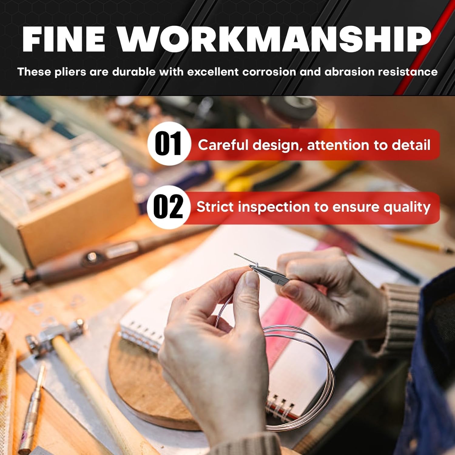 【Overall Material】The jewellery pliers set is made of high-strength carbon steel, undergoes precise heat treatment and polishing processes, ensuring durability, rust resistance, and scratch resistance. This guarantees no marks are left during jewellery making, wire wrapping, or precision repairs. The set also features ergonomically designed rubber anti-slip handles for a comfortable grip, effectively reducing hand fatigue, allowing for stable control even during prolonged jewellery making.