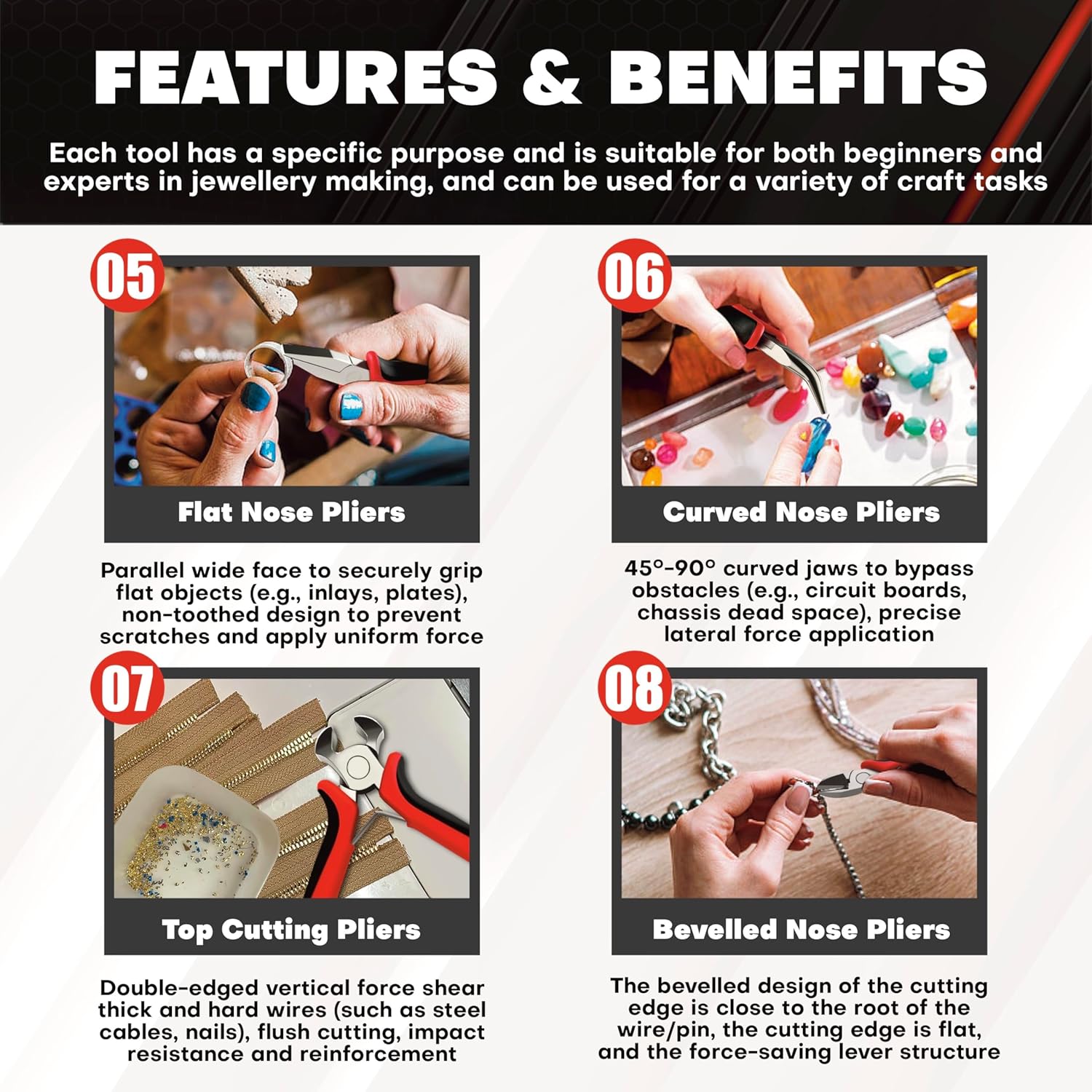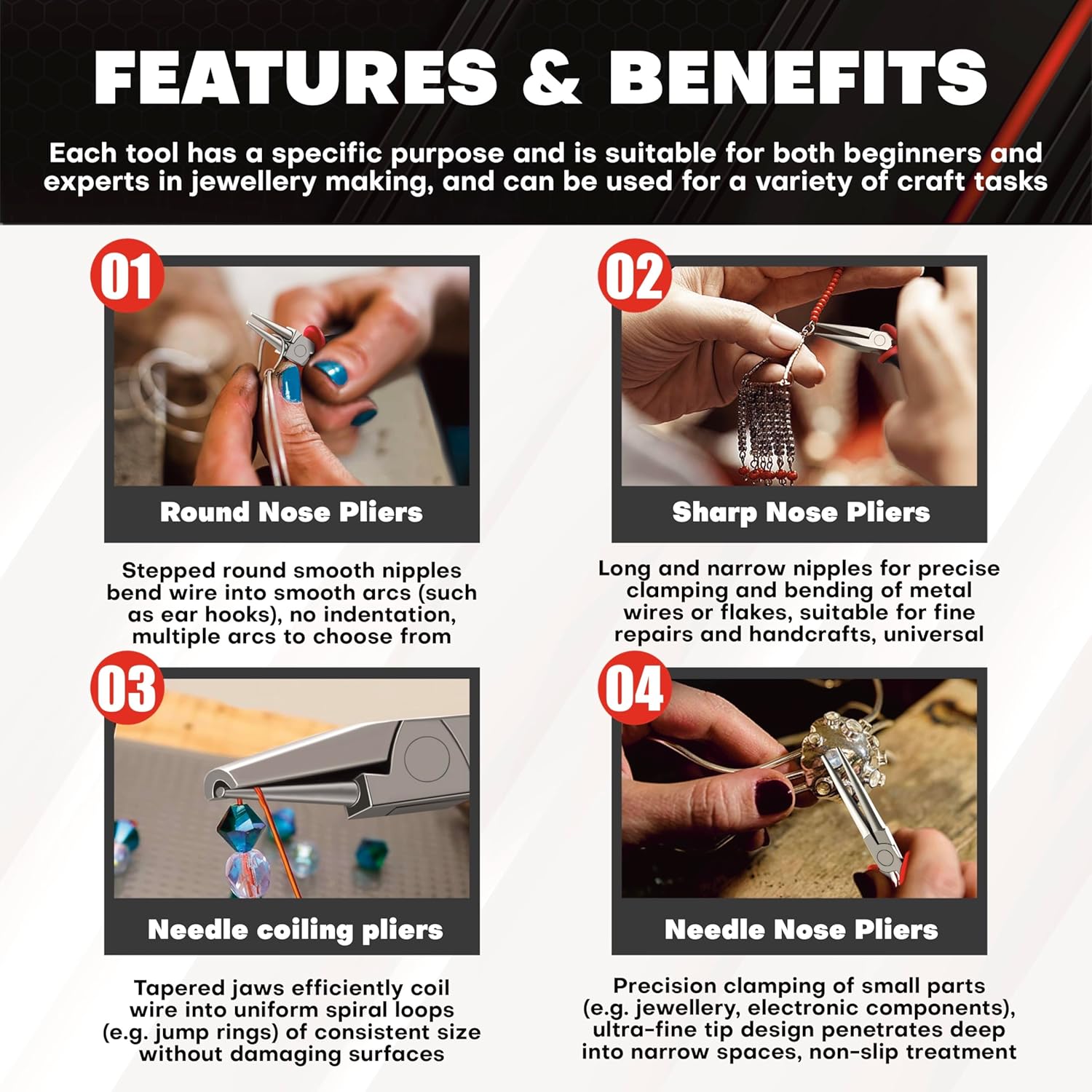 【Full Process Support】The jewellery tools perfectly supports the entire jewellery-making process, covering professional techniques such as wire wrapping, ring making, and crimping. It is an ideal choice for making bracelets, earrings, necklace repairs, pendant design, and various DIY jewellery projects. Whether you are into jewellery repair, bead art, or metal wire craftsmanship, this tool set can meet your creative needs.
