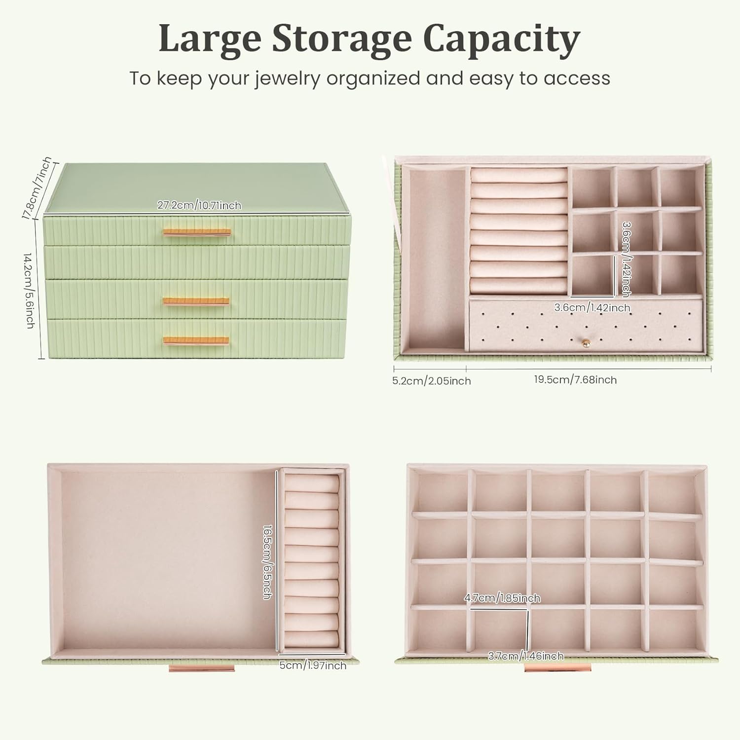 Large Capacity Jewelry Box: The closed size of this jewelry storage box is 10.71 x 7 x 5.6 inches. The jewelry organizer box is equipped with multiple compartments, which can store various types of jewelry such as earrings, rings, necklaces, bracelets, watches, and brooches. And equipped with detachable compartments for storing large jewelry items