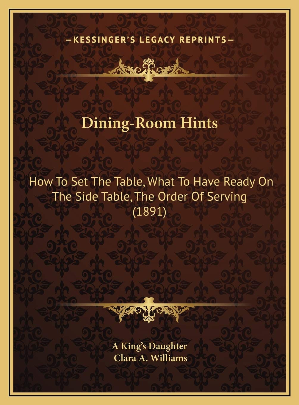 “”Dining-Room Hints: How To Set The Table, What To Have Ready On The Side Table, The Order Of Serving”” is a guidebook written by A King’s Daughter in 1891. The book provides tips and advice on how to properly set a dining table, what items should be placed on the side table, and the proper order of serving dishes during a meal. The author emphasizes the importance of presentation and etiquette in hosting a successful dinner party or formal meal. The book includes illustrations and detailed descriptions of various table settings and serving arrangements. It is a valuable resource for anyone interested in the art of dining and entertaining.This scarce antiquarian book is a facsimile reprint of the old original and may contain some imperfections such as library marks and notations. Because we believe this work is culturally important, we have made it available as part of our commitment for protecting, preserving, and promoting the world’s literature in affordable, high quality, modern editions, that are true to their original work.