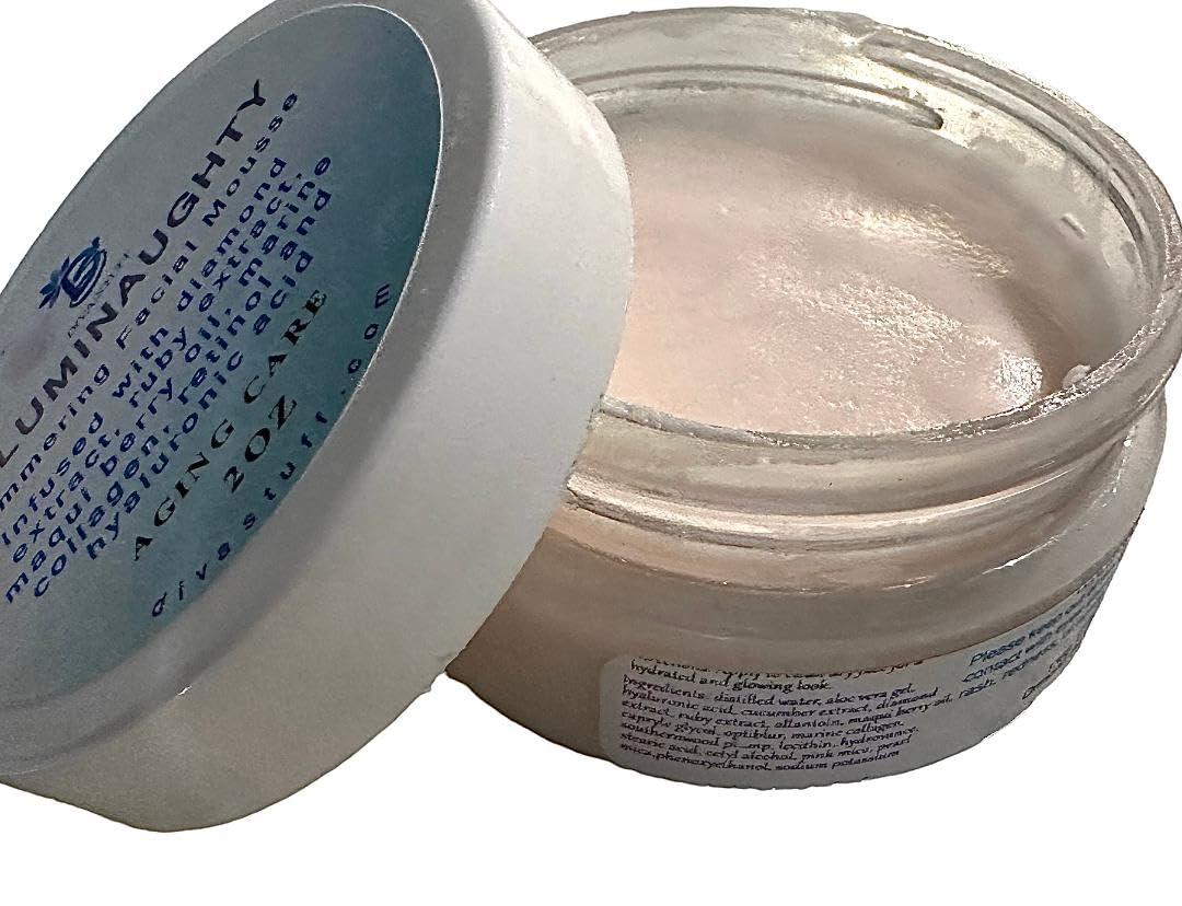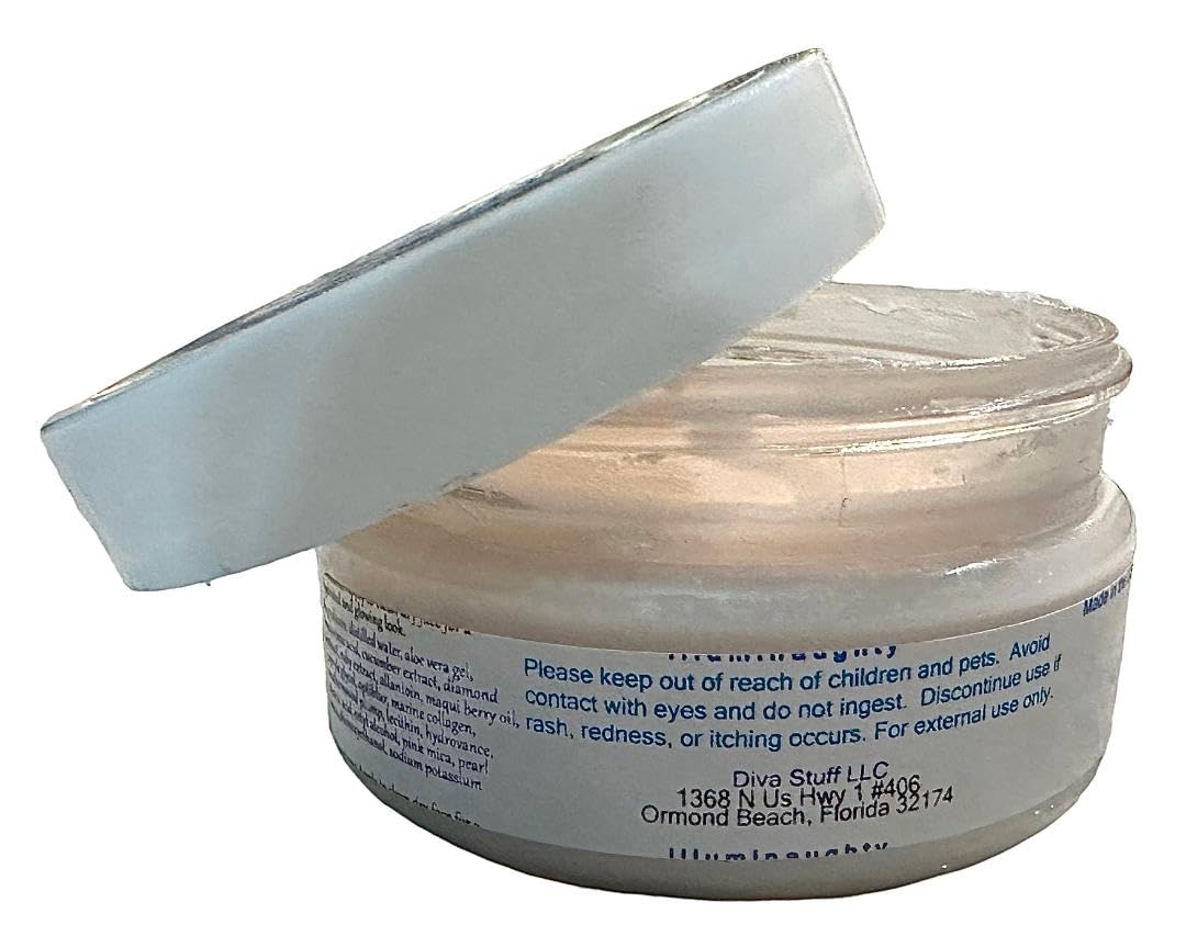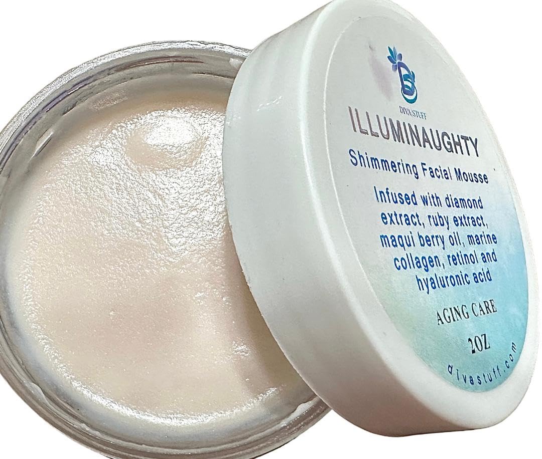 Diva Stuff Illuminaughty Is A Shimmering Facial Mousse for the fancy lady. It is infused with diamond and ruby extracts, retinol, marine collagen and hyaluronic acid. It is perfect for all skin types. It has the benefits of several anti aging ingredients without the negative effects of clogged pores or oily skin. Apply directly to dry, clean skin. You may use alone or under/over one of your favorite face creams. Some of the natural ingredients will sink right into fine lines to promote a smoother and plumper complexion.