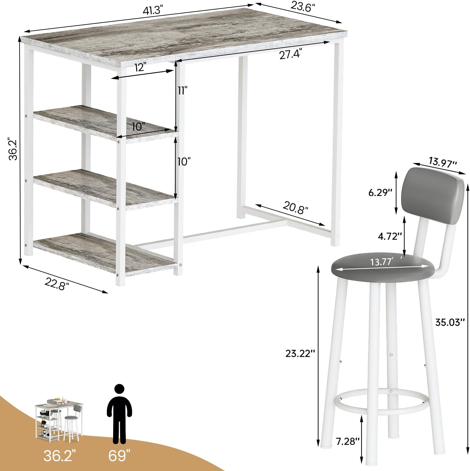 Assemble & Dimension – The kitchen table and chairs set of 2 are easy to assemble, including all necessary accessories. Dining Table with Storage Size: 41.3″ L X 23.6″ W X 36.2″H; Pub Chair Size: 13.77″ L X 13.77 ” W X 35″ H