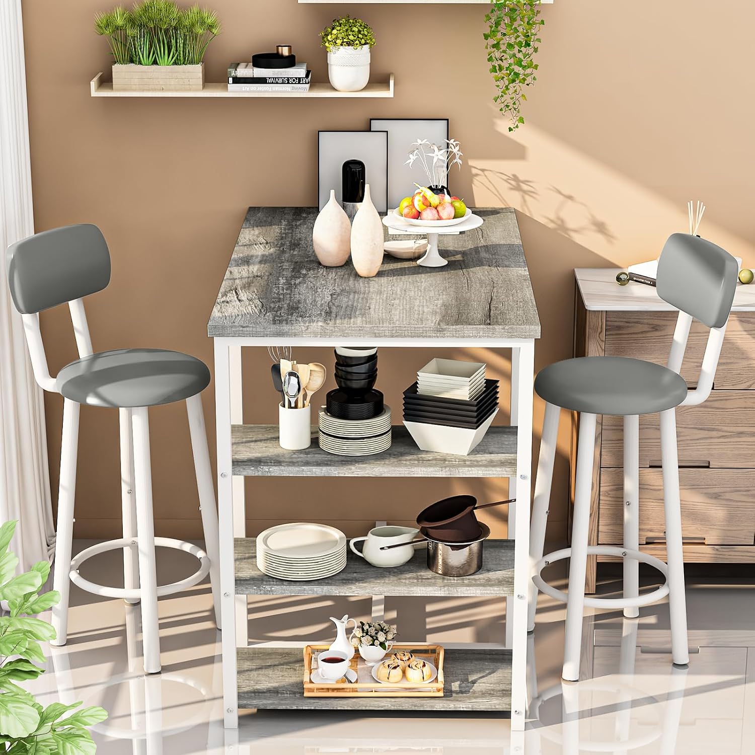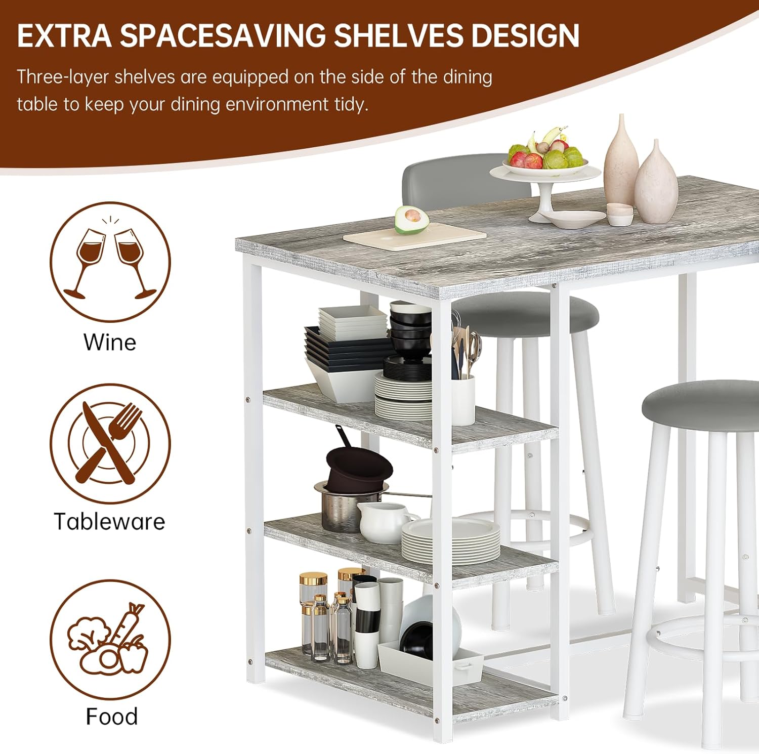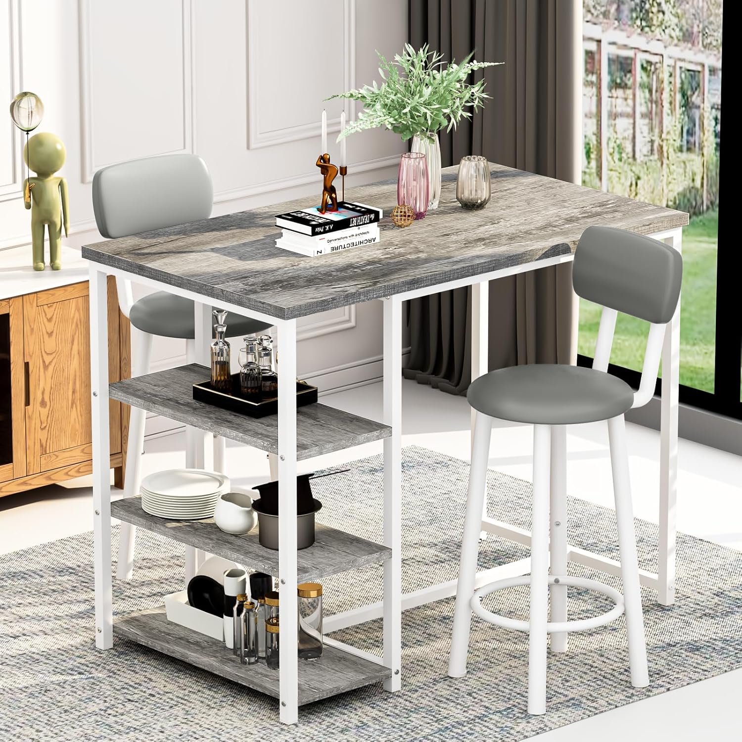 Premium Material & Stable Structure – The bar dining table with storage tabletop is Designed with a metal finish base and 3 storage shelves to meet all your storage needs. Dining table: 250 lbs, Bar stool: 350 lbs
