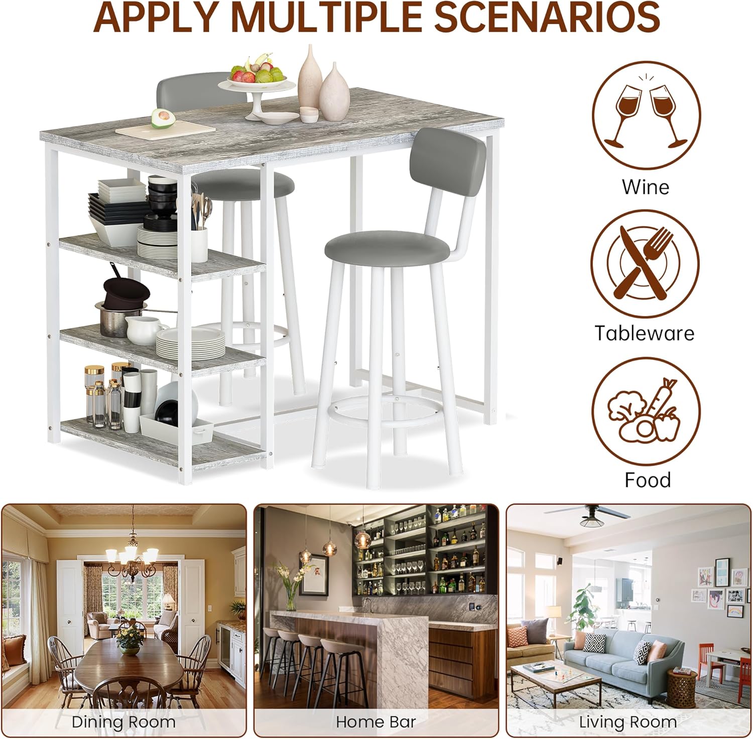 Multipurpose Table – For those who own a small kitchen, this bar table set can also be used as a kitchen island. With 3 practical open shelves. Pub table set dining table with storage offers your kitchen, apartment, and bar.