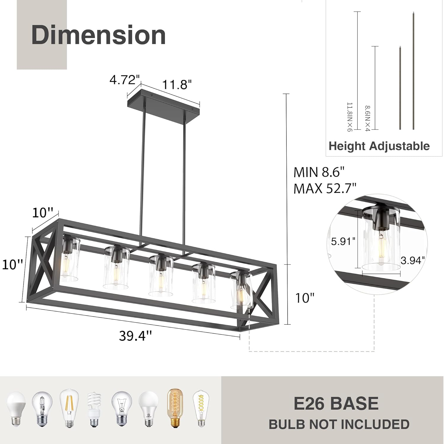 ADJUSTABLE HEIGHT: Some parts are on the fixture frame.The size of our dining room light fixture is L 38.6 x W 10.2 x H 11-51.2(in), among farmhouse dining room light fixture we give 4pcs 11.81in, 2pcs 7.87in and 2pcs 3.94in rods to help you adjust the height, you can adjust the most suitable height to light your room. The glass shade size for rectangle light fixture is L3.9 x W3.9 x H5.91(in). Special tip is we are suitable for E26 base bulbs (not included), rated voltage 110-120V, MAX power 60W, in line with the US standard. Note: Our chandelier is not suitable for sloped ceilings.
