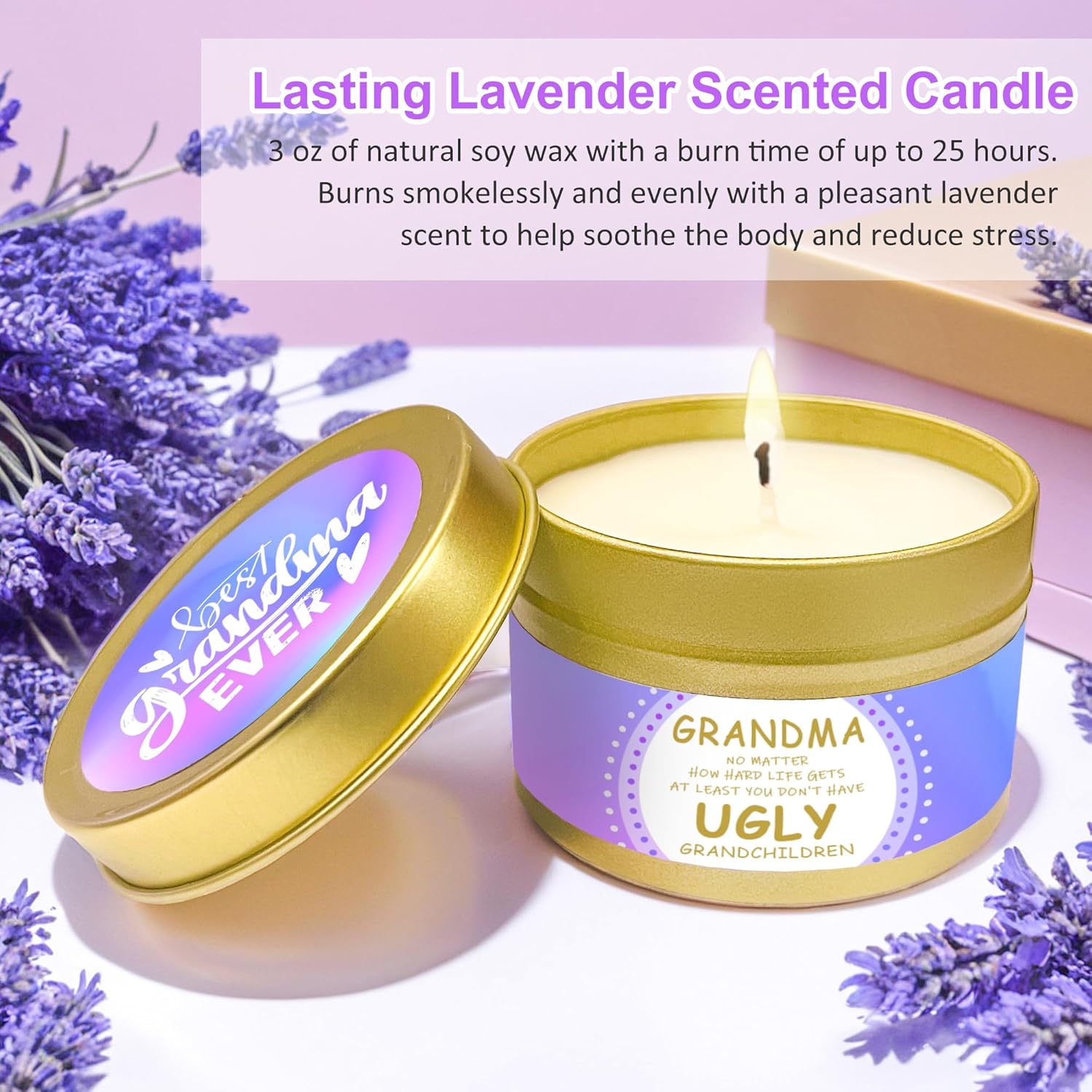 [Grandparents Day Gifts for Grandma] Purple Gift Box, Presenting a Lavender Themed Women’s Gift Basket that will impress her at first glance; our gift promises an unforgettable out-of-the-box experience, the perfect way to express caring&love, and the ideal gift for all the amazing women in your life. Each gift box contains: 20oz insulated stainless steel tumbler x1, one pair of plush socks, soy wax lavender scented candle x1, natural stone bracelet x1, and gift card to write your special message