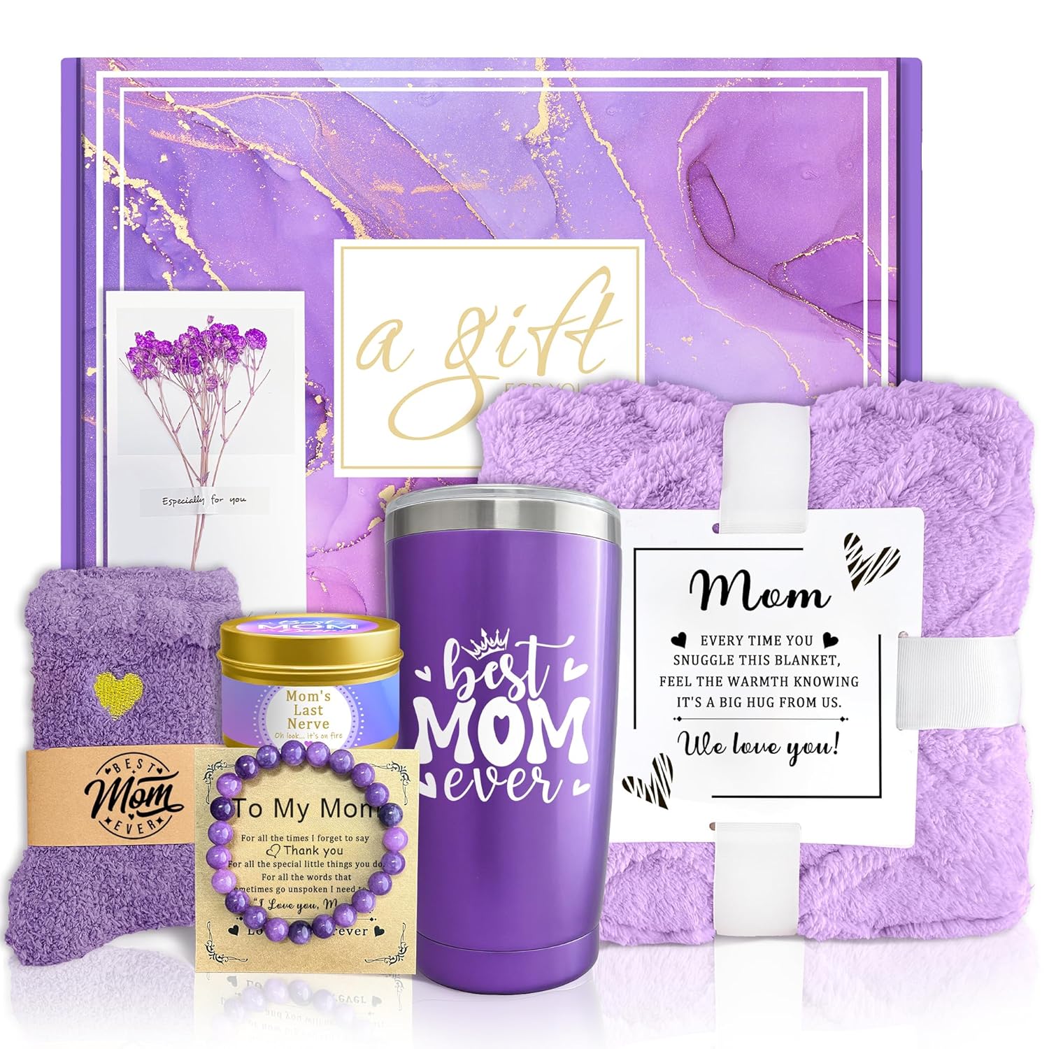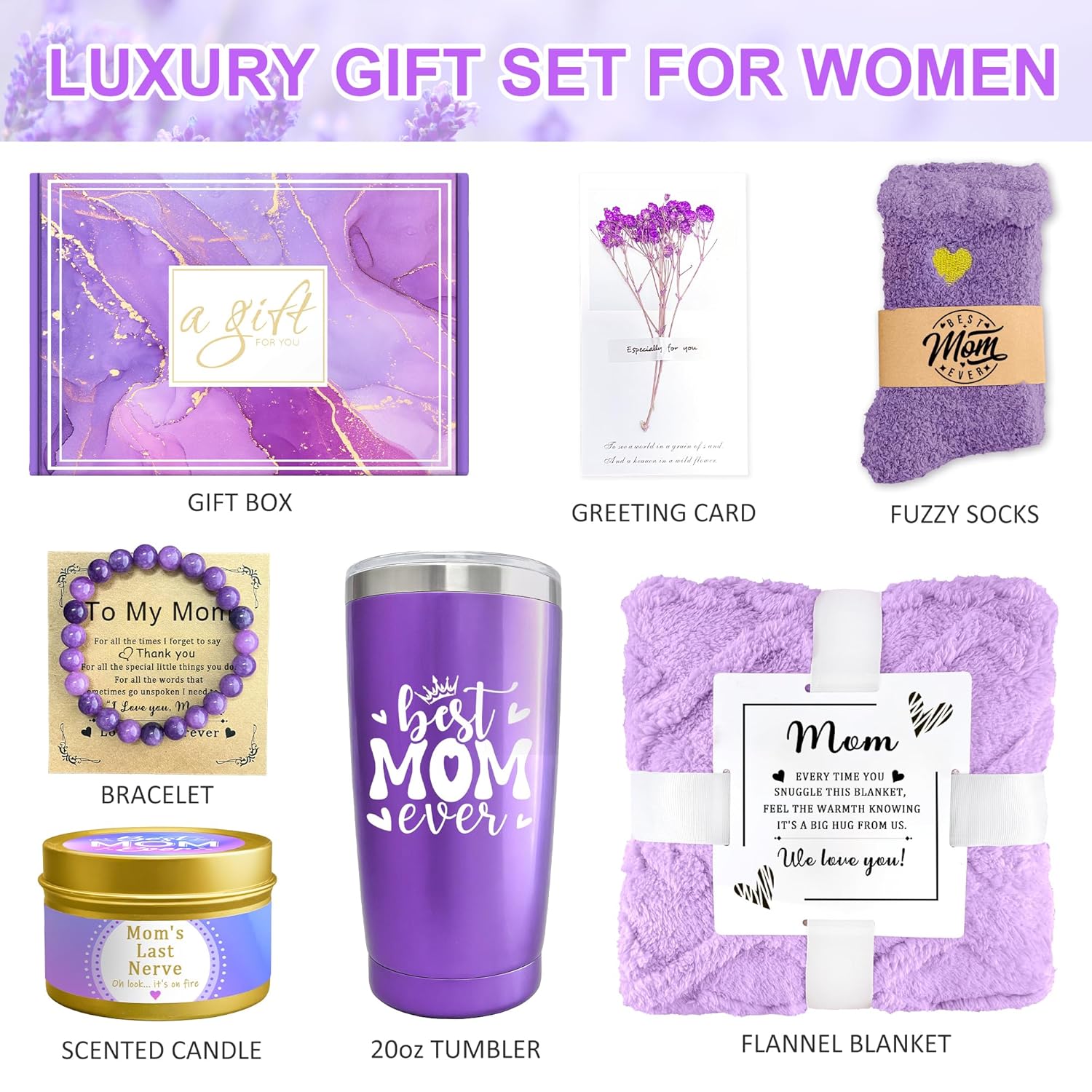 Birthday Gifts for Mom – Purple Gift Box, Presenting a Lavender Themed Women’s Gift Basket that will impress her at first glance; our gift promises an unforgettable out-of-the-box experience, the perfect way to express caring and love, and the ideal gift for all the amazing women in your life. Each gift box contains: 20 oz insulated stainless steel tumbler x1, one pair of plush socks, soy wax lavender scented candle x1, natural stone bracelet x1, and a gift card to write your special message