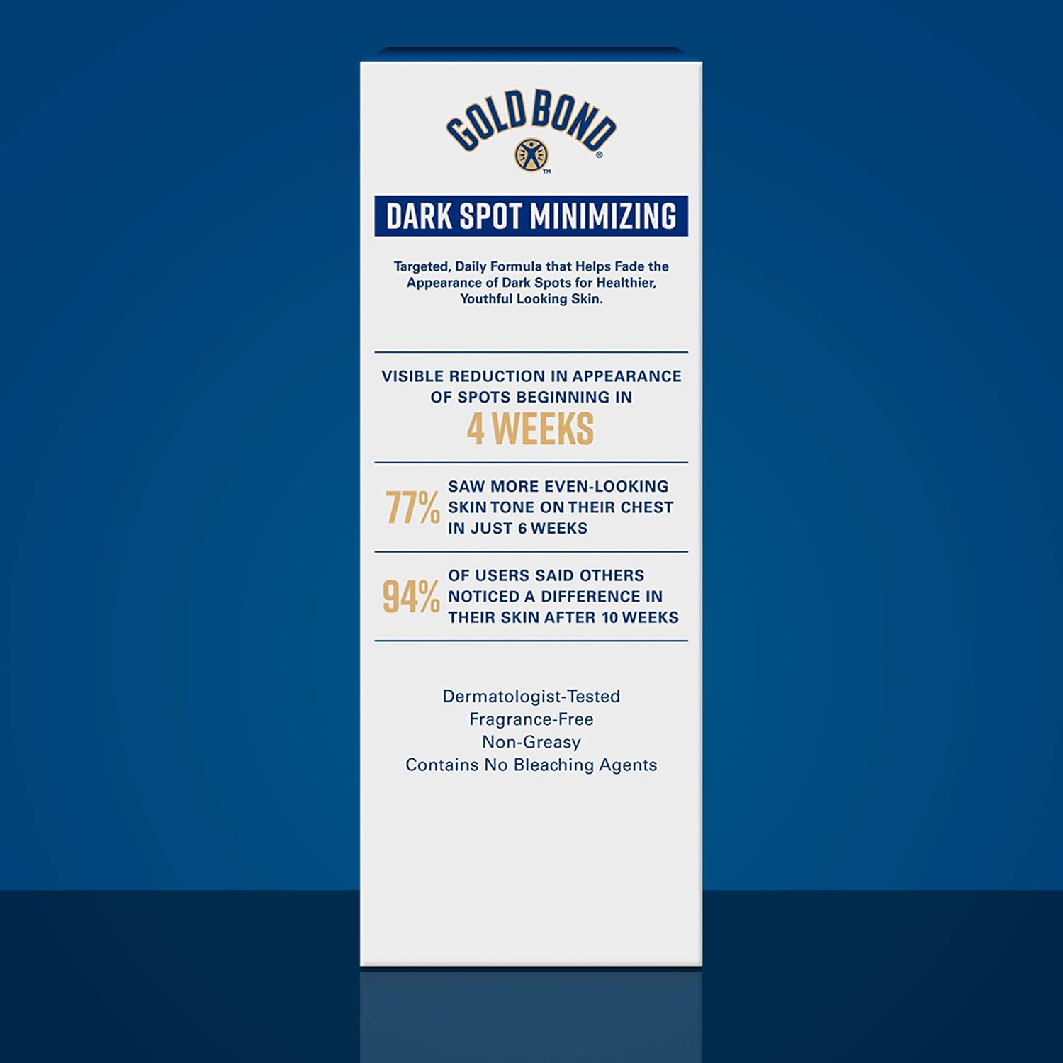 The appearance of dark spots can age the look of your hands, arms, neck, and chest. Gold Bond Dark Spot Minimizing Body Cream is a clinically tested formula that’s designed to help reduce the appearance of dark spots. In fact, most users saw visible reduction in appearance of spots beginning in 4 weeks. Gold Bond Dark Spot Minimizing Body Cream is hypoallergenic, and doesn’t contain bleaching agents or fragrance, making it gentle enough for daily use when used as directed. Use this gentle exfoliating body cream to improve the appearance of dark spots and give your skin a more youthful-looking appearance.