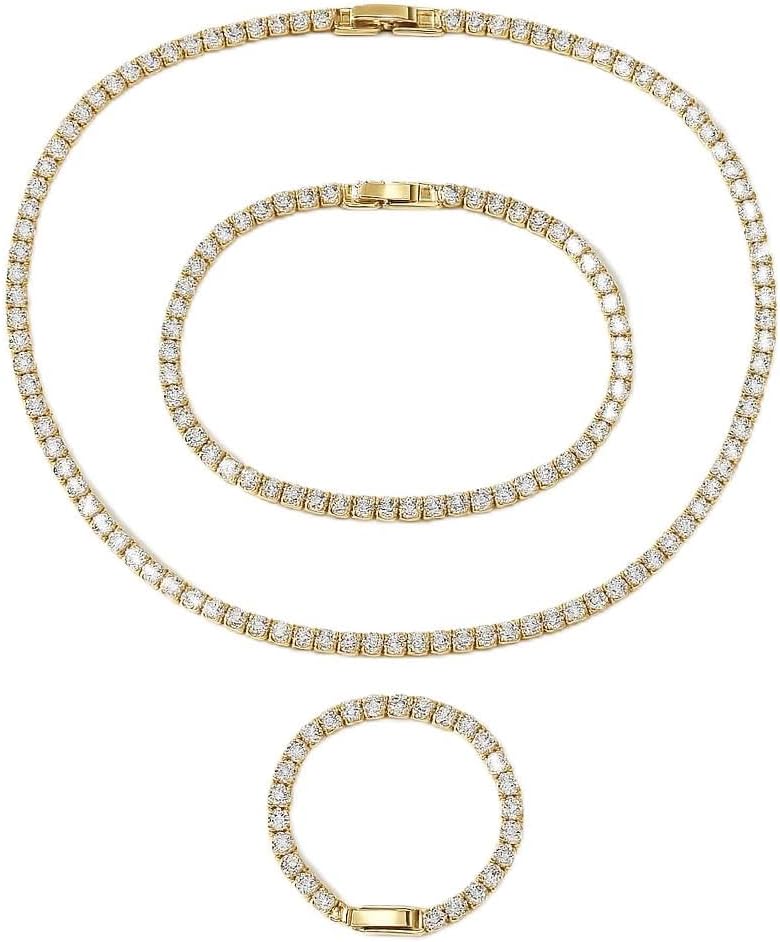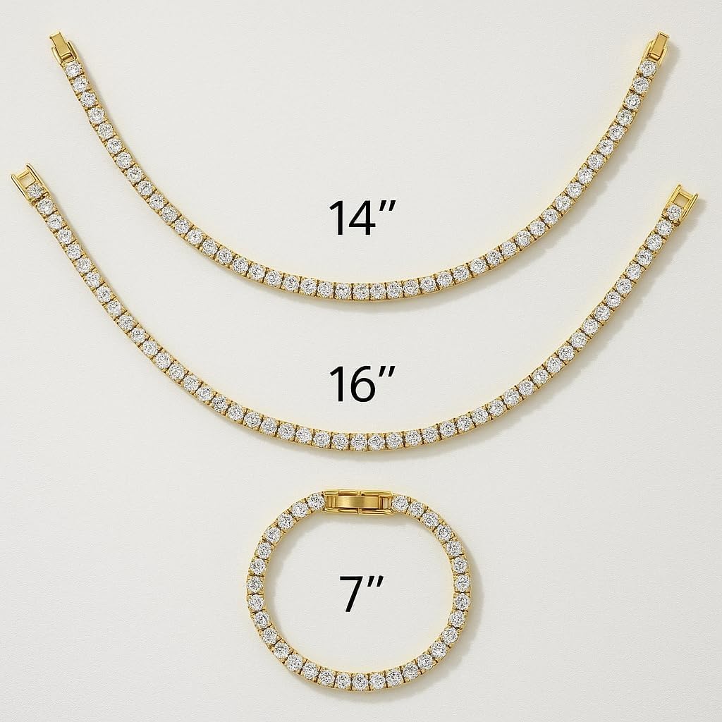 Set Includes: 2 Necklaces + 1 Bracelet Necklace Lengths: 14″ and 16″ Bracelet Length: 7″ Material: Brass with 18K Gold Plating Stones: High-grade Cubic Zirconia Closure Type: Box Clasp with Double Security Finish: Iced-Out / High Polish Style: Modern Tennis Chain Set