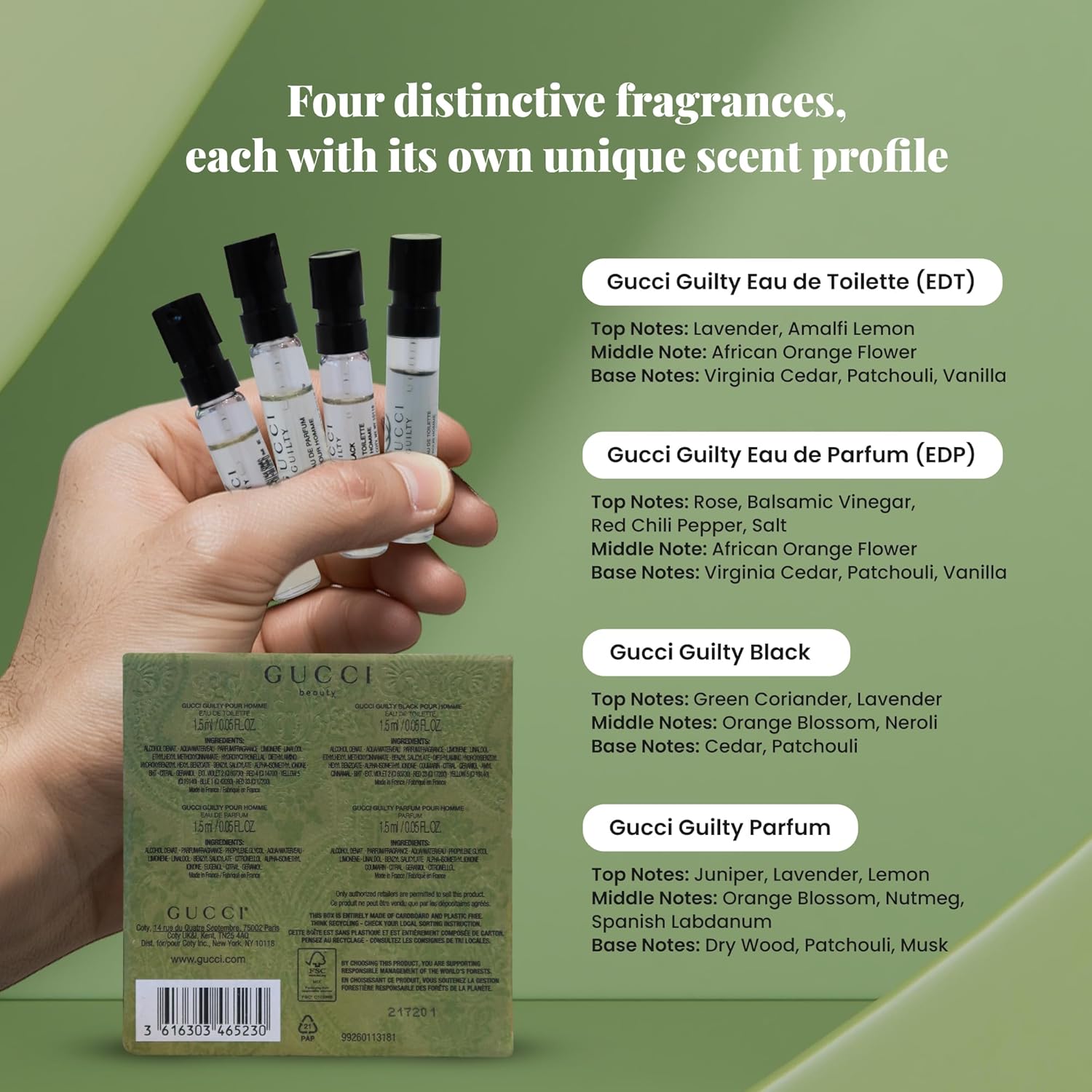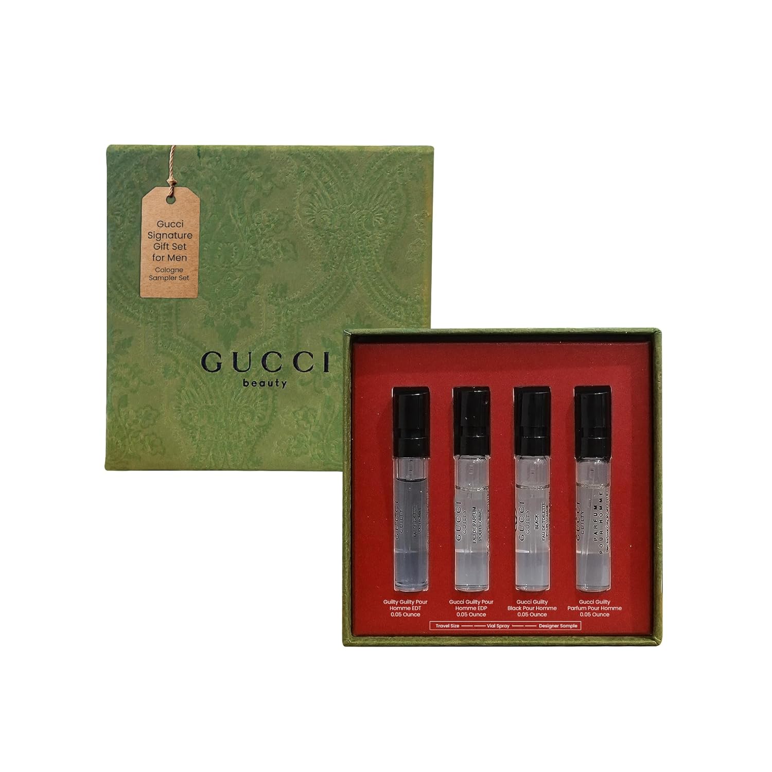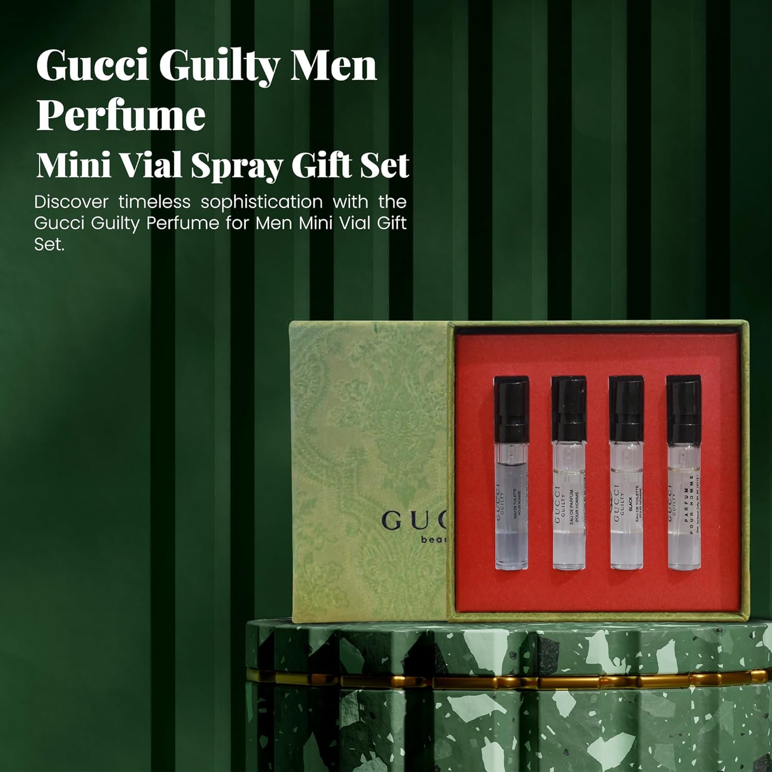 GUILTY PERFUME MINI VIAL SPRAY GIFT SET – A sophisticated collection of Gucci Guilty fragrances in mini spray vials. This includes Guilty Pour Homme, Guilty Black Pour Homme EDT, Guilty Pour Homme EDP, and Guilty Pour Homme Parfume – all in 0.5 fl oz.