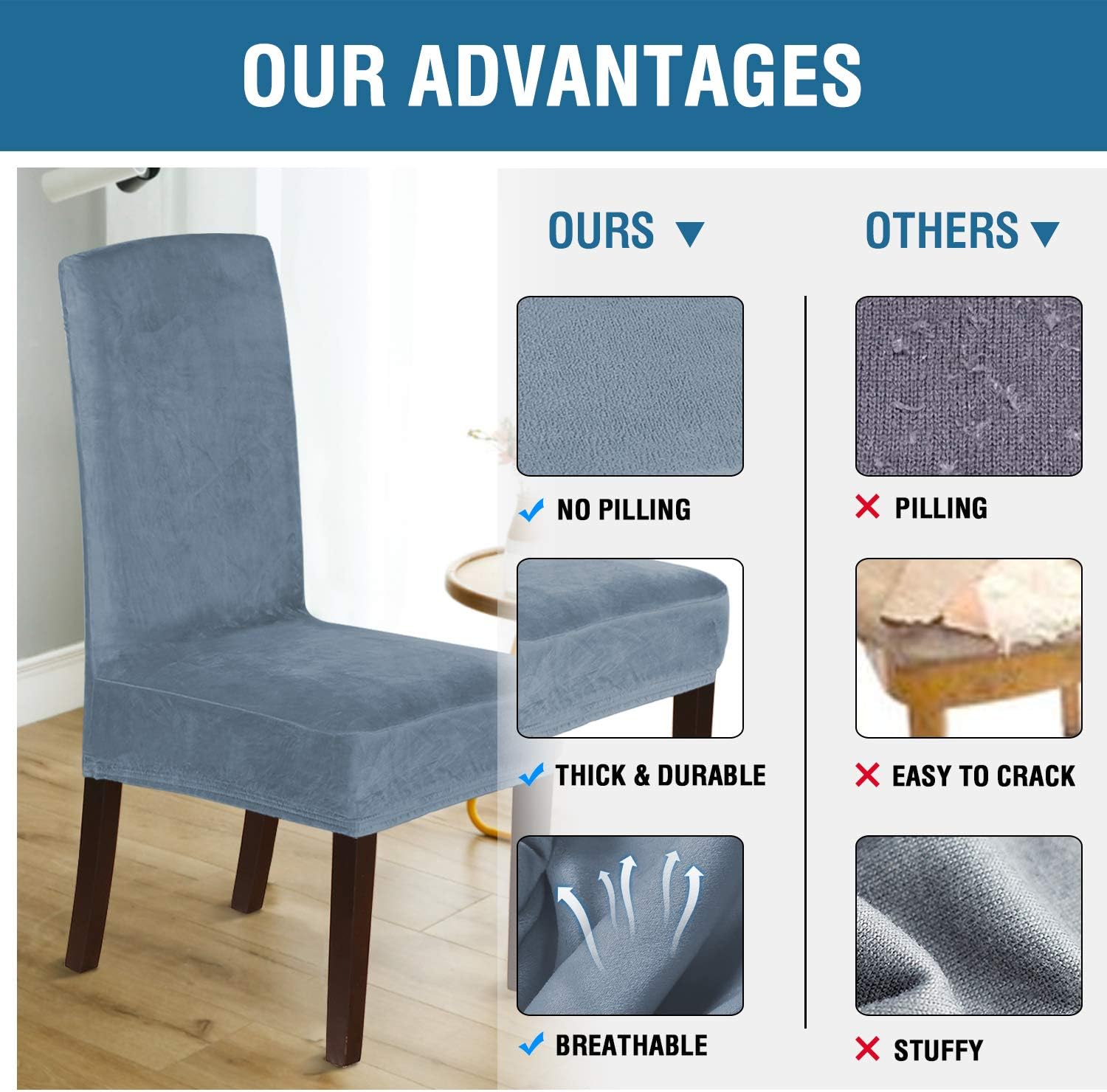 AESTHETIC DECOR: These casual, soft and comfortable original velvet slip covers will refresh worn upholstery and add new life to your chairs, mix & match in your living room or even transform your kitchen with this beautiful dining chair slipcover. Sporting a solid hue to complement any décor, neutral colors that complement both traditional and modern styles