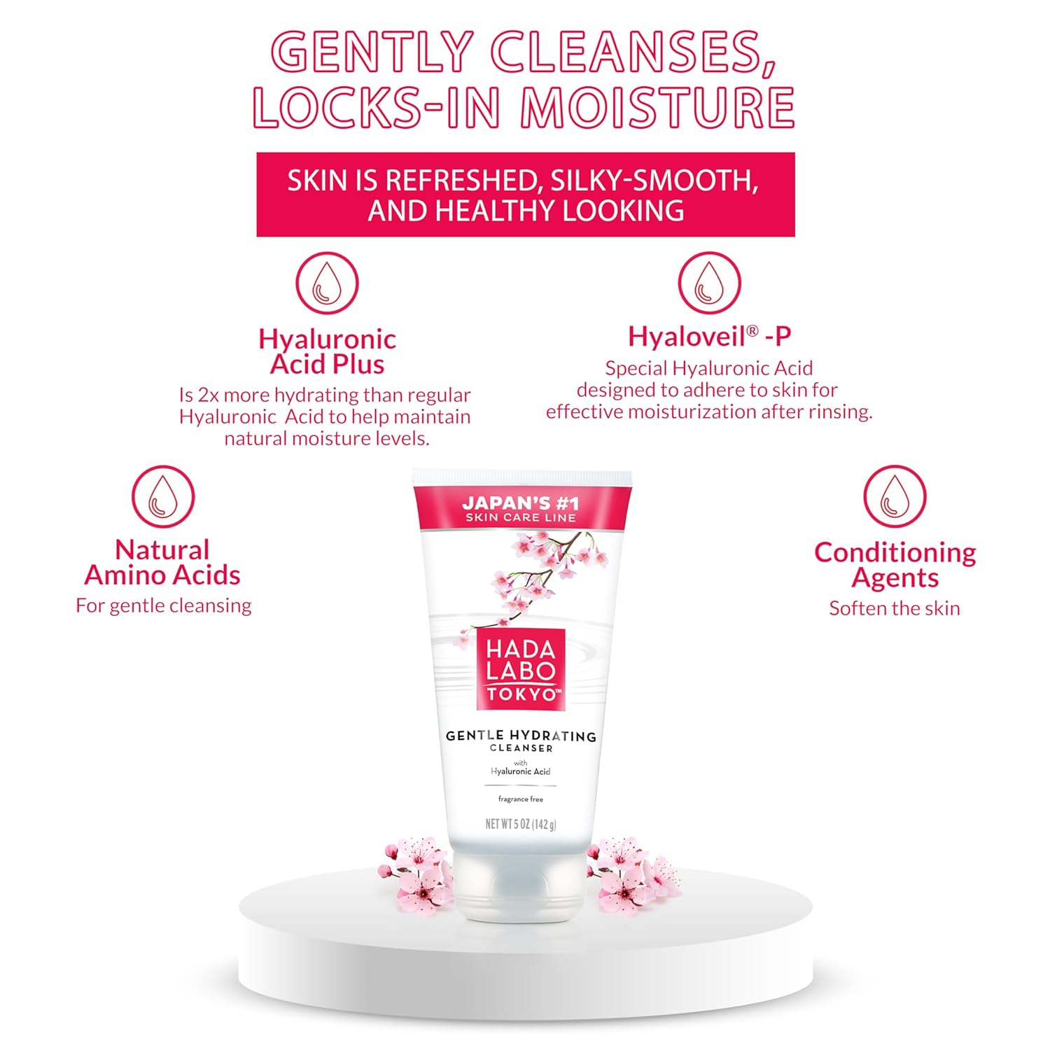 JAPAN’S No. 1 SELLING SKIN CARE LINE: Hada Labo Tokyo Gentle Hydrating Cleanser with hyaluronic acid is a skin-cushioning foaming cleanser is ultra-gentle; washes away dirt, oil, and impurities easily with no residue; locks in essential moisture