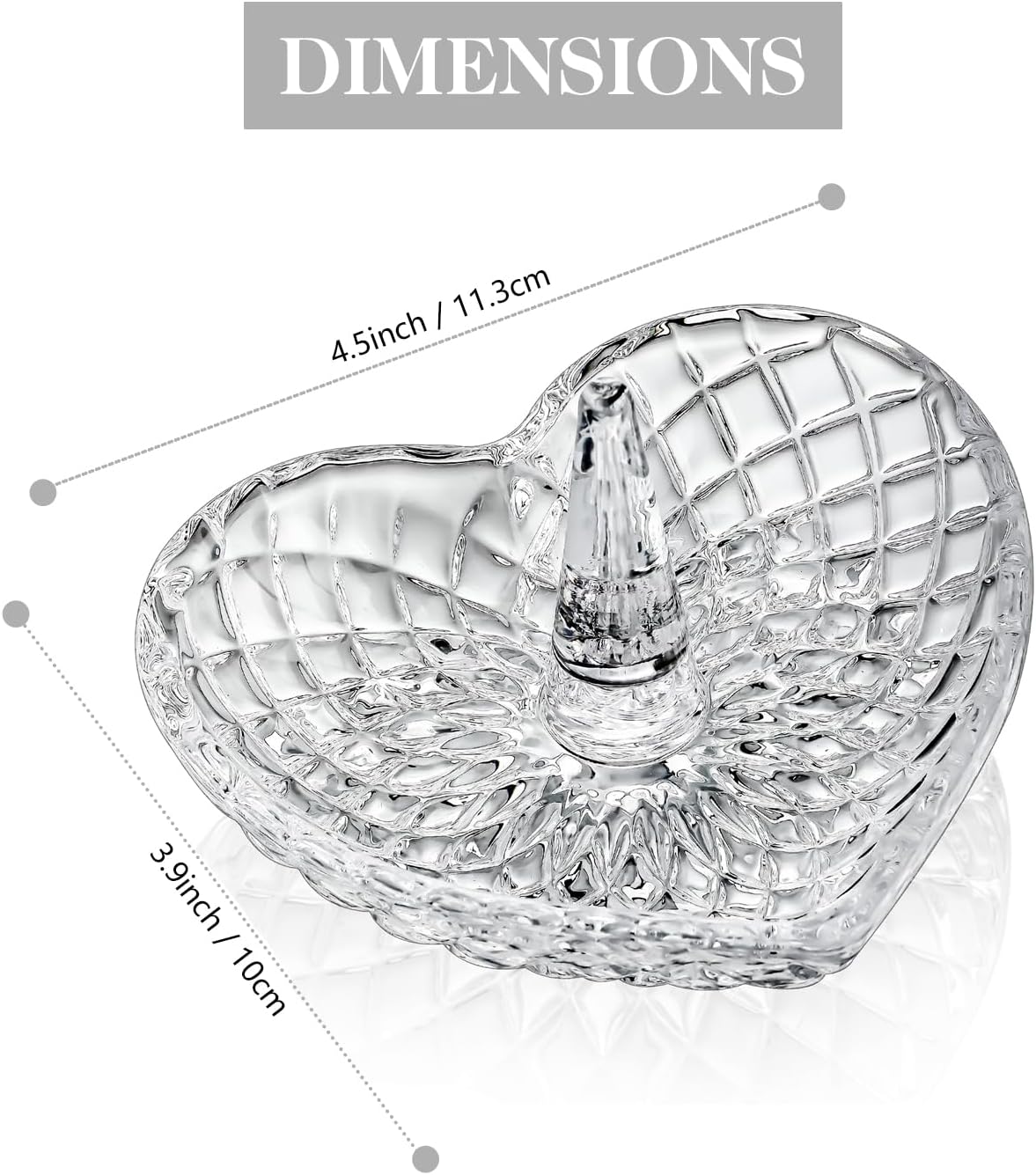 Compact Size: Glass Ring Holder L 4.5” * W 3.9” * H 2.6” (11.3 cm*10 cm*6.9 cm). As a holder for displaying and organizing rings, necklaces, bracelets, bangles, earrings and other jewelry, it is easy to store and less to worry about losing