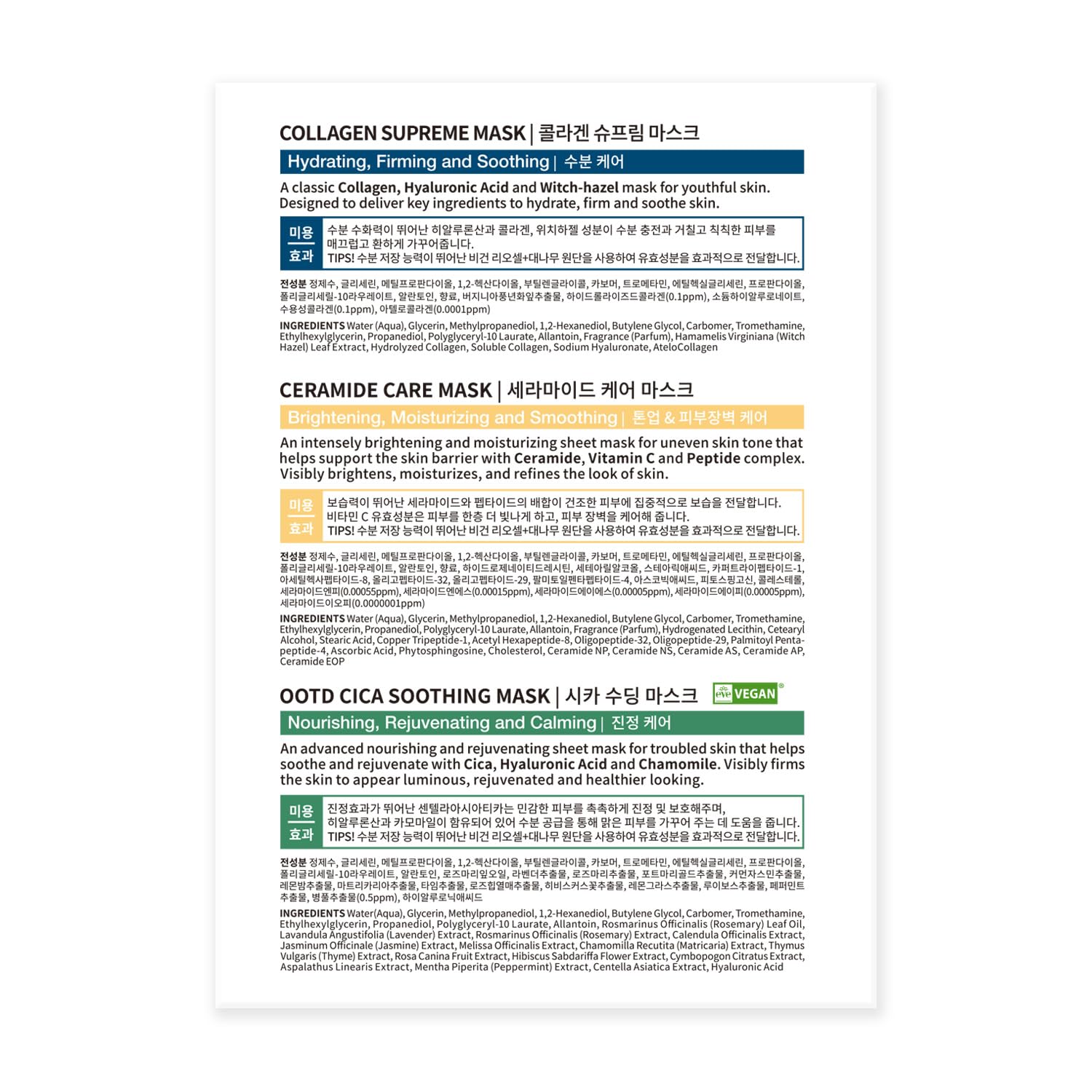 CLINICALLY PROVEN TO WORK – All #OOTD products are clinically tested to prove its efficacy. COLLAGEN SUPREME MASK confirmed to hydrate, increase skin elasticity and optimize pH value of the skin. CERAMIDE CARE MASK to hydrate, increase skin elasticity, brighten the skin and optimize its pH value. CICA SOOTHING MASK confirmed to hydrate and increase skin elasticity.