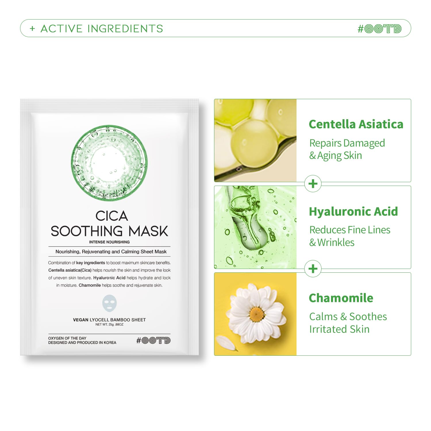 CICA SOOTHING MASK – Calming, Nourishing and Rejuvenating with Cica, Hyaluronic Acid and Chamomile. Repairs and sooths damaged and sensitive skin by enhancing the body’s natural healing processes.