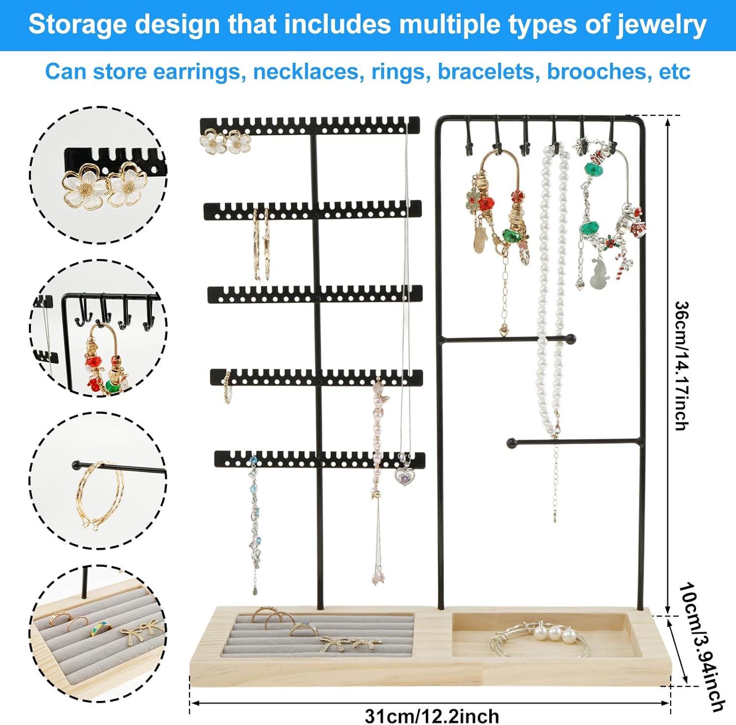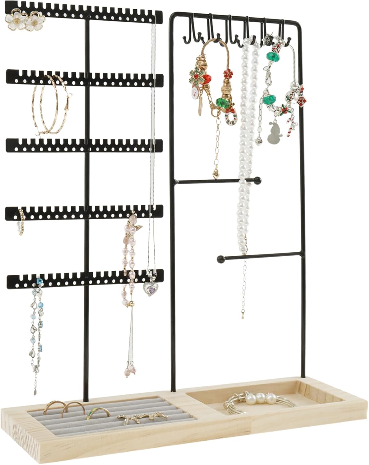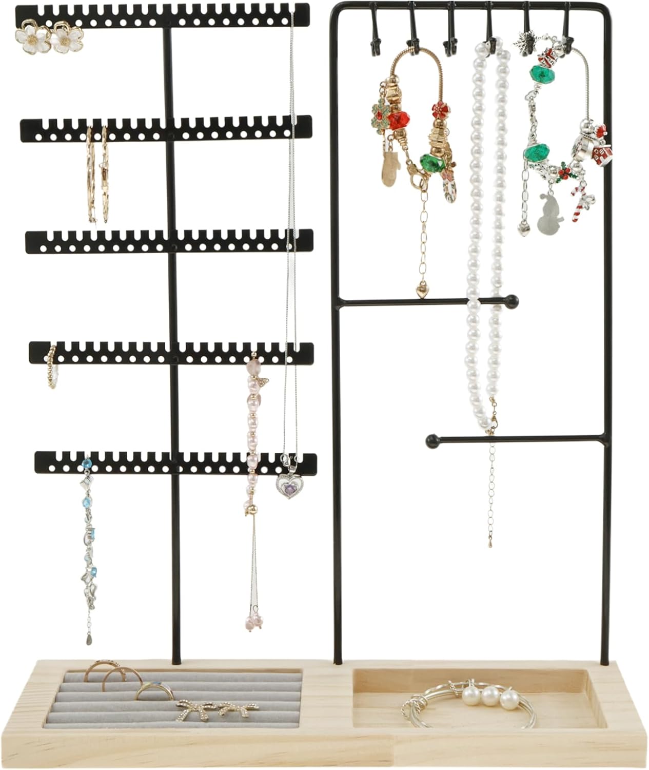 Jewelry Holder with Wood Base Multifunctional Jewelry Organizer Large Capacity Jewelry Stand Stable Jewelry Holder Organizer for Earring Necklace Ring Bracelets