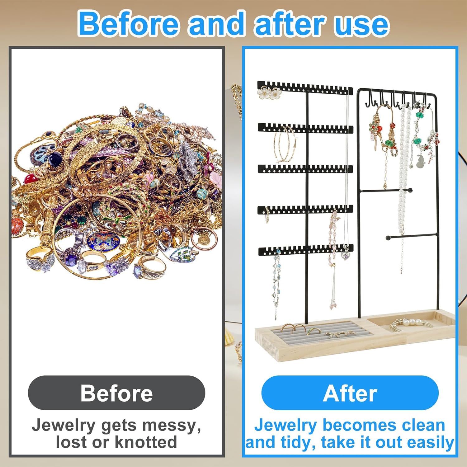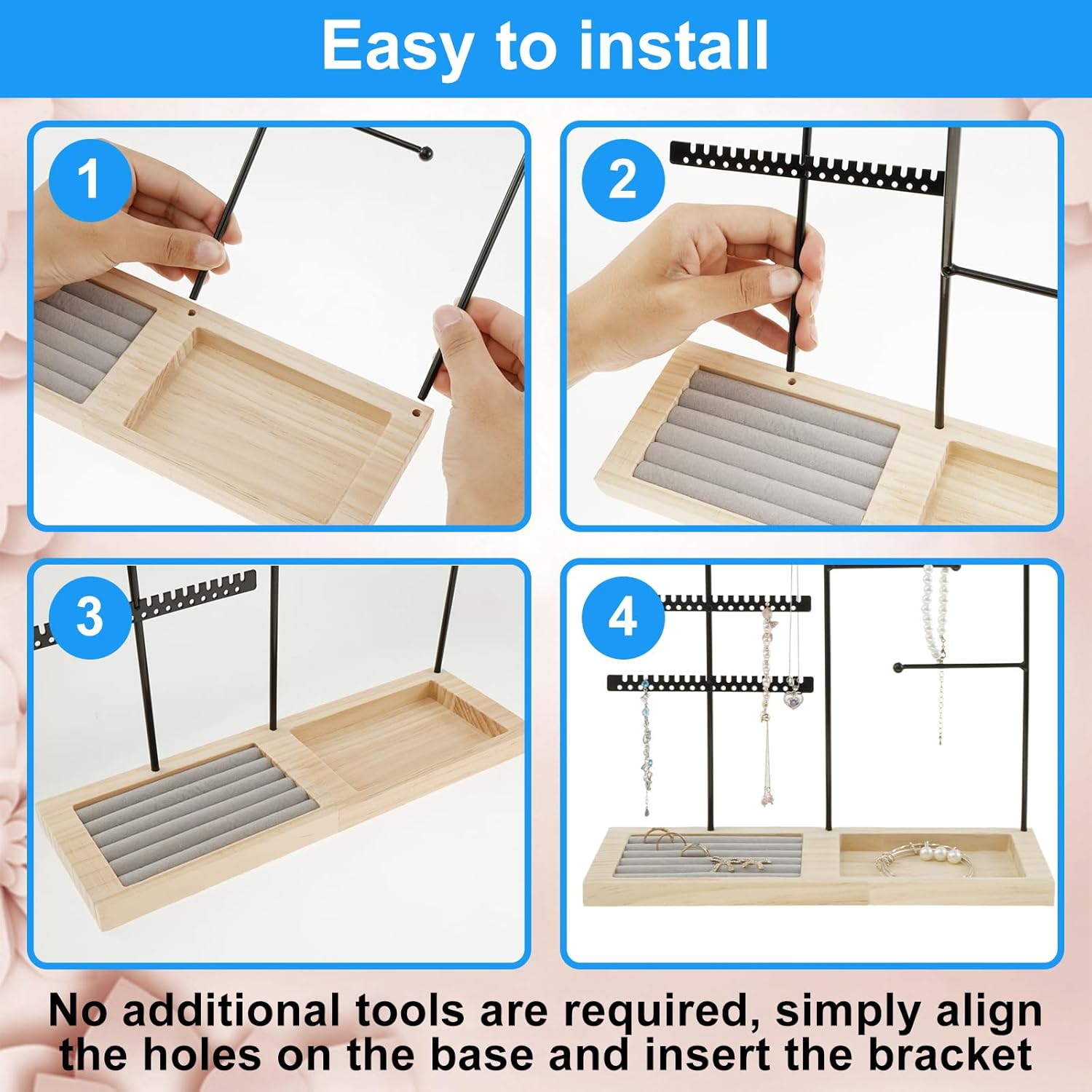 Easy to Install: This jewelry holder organizer is effortless to install and does not require any additional tools. What you need to do is simply align the holes on the base and insert the metal frame