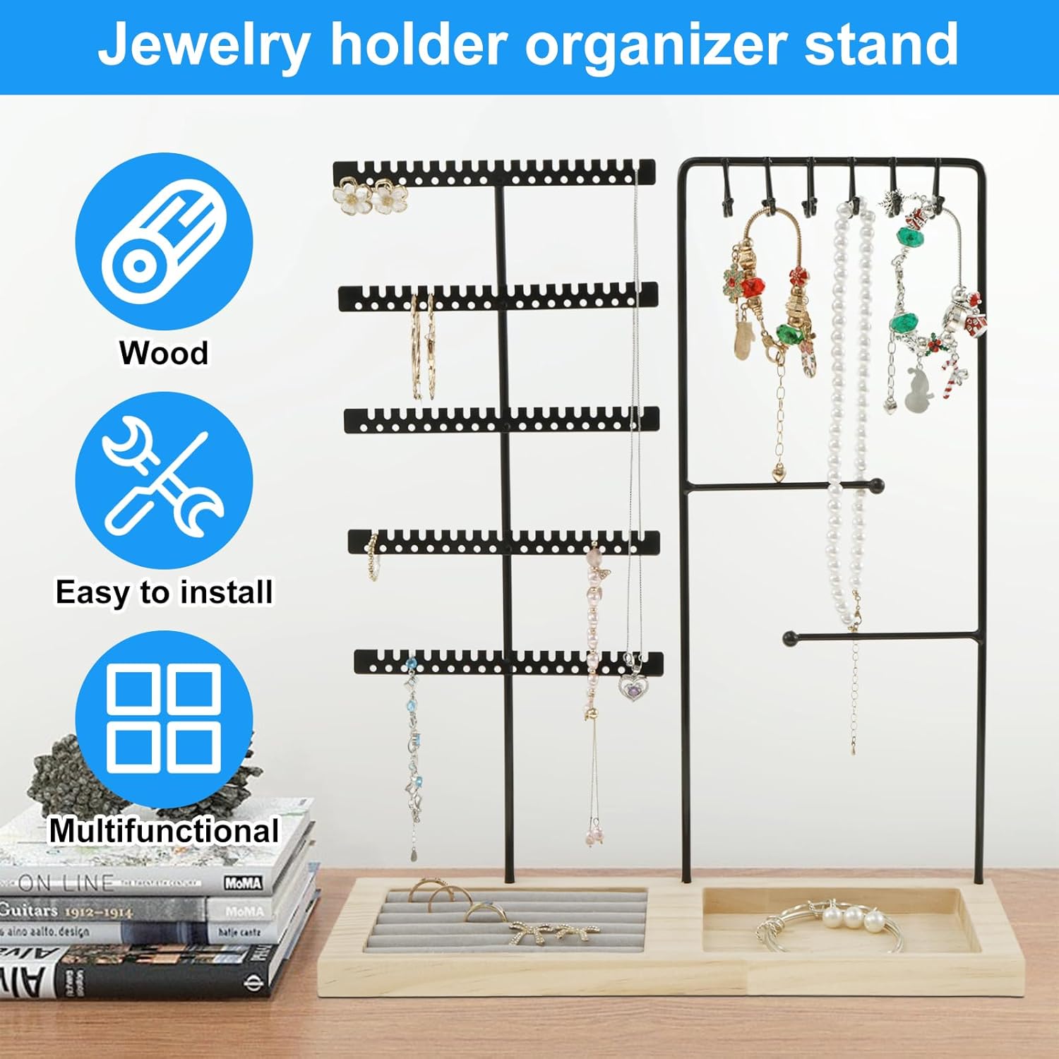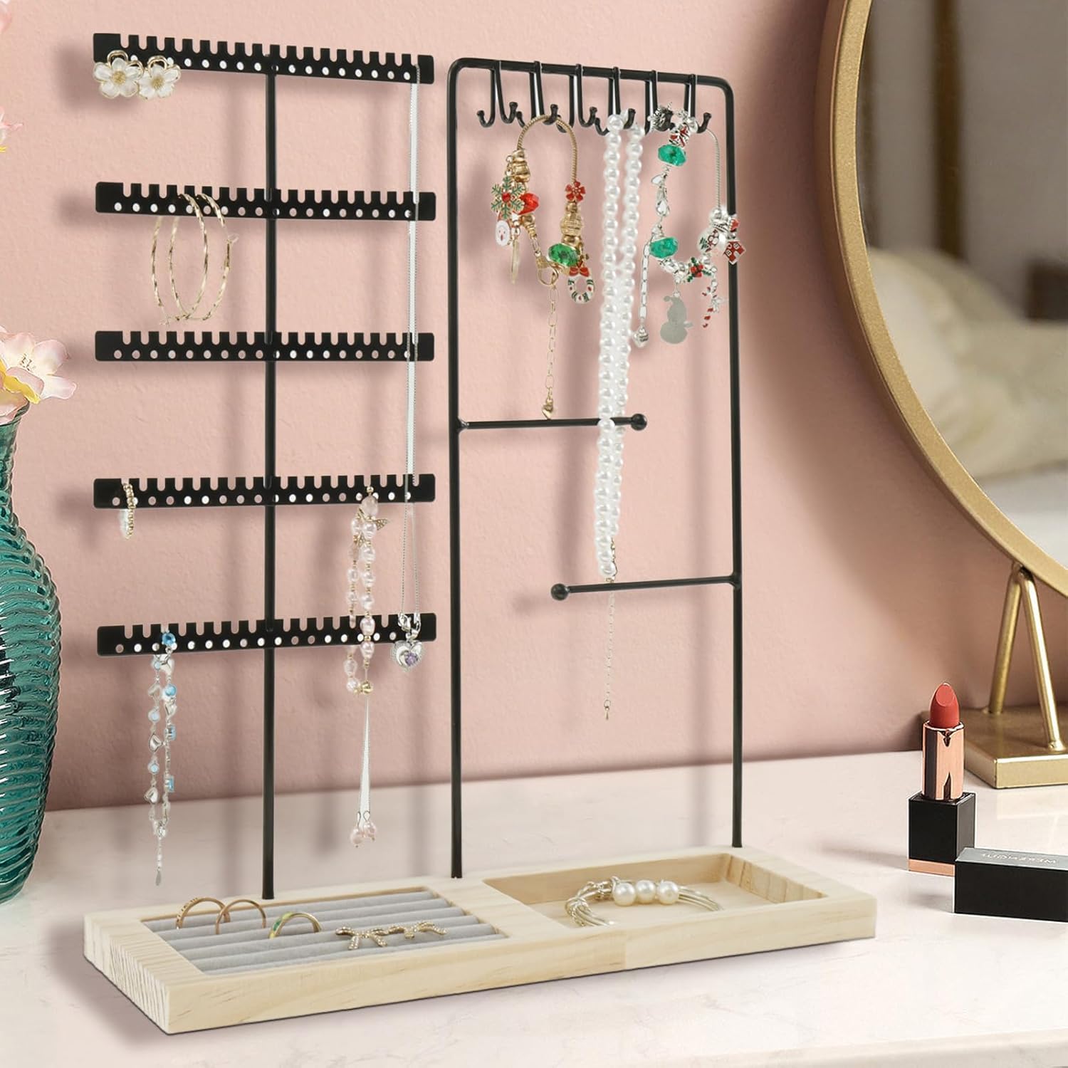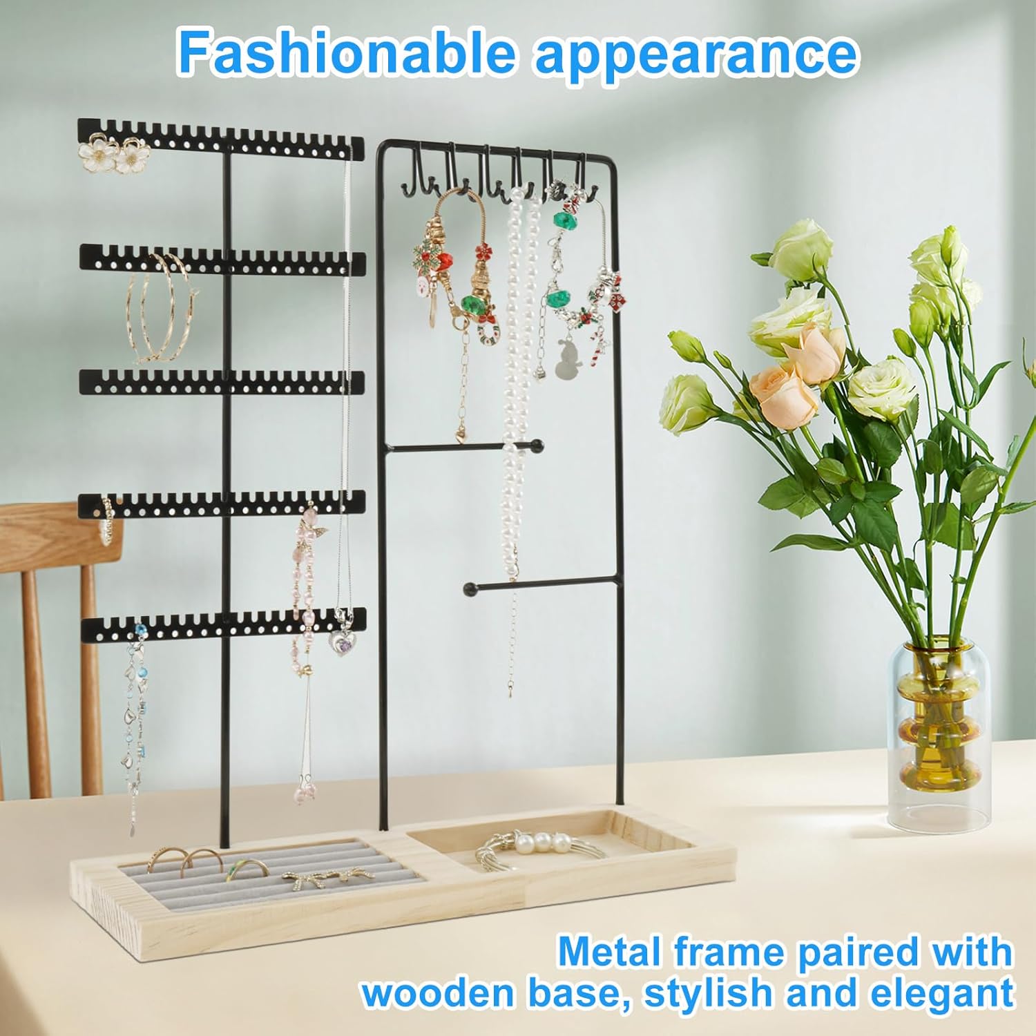 Stylish and Elegant Appearance: This jewelry holder organizer boasts a beautiful appearance. It consists of a metal frame and a wood base, which looks stylish and elegant